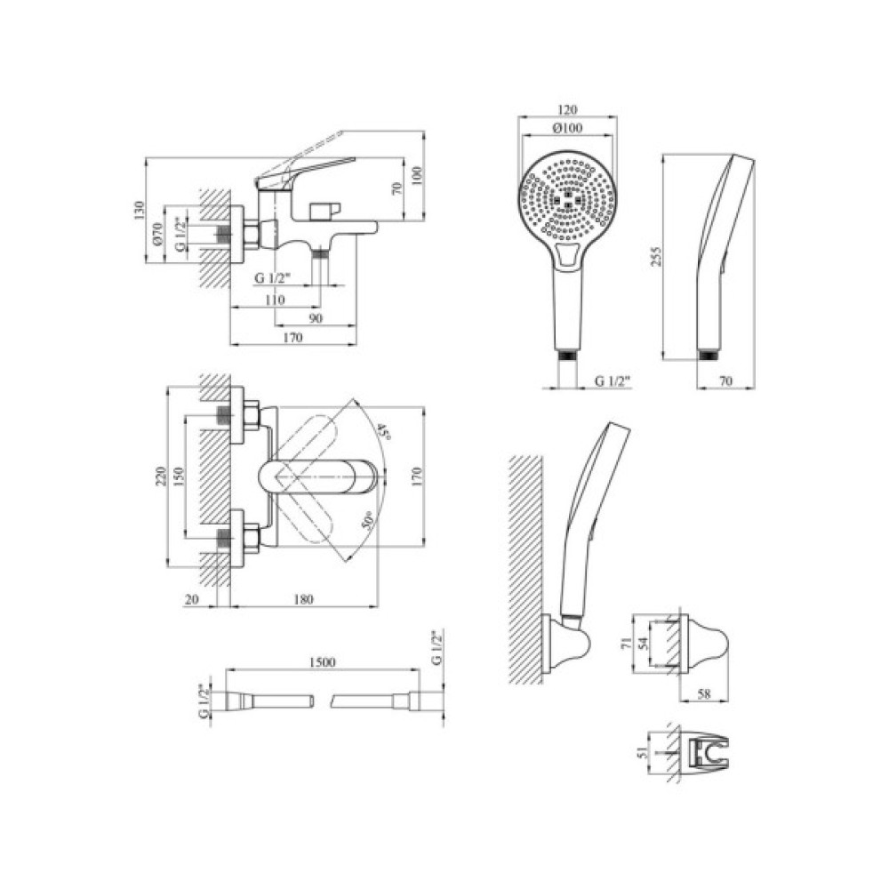 Комплект поставки змішувач; душовий шланг; тримач для душу; інструкція; лійка для ручного душу; кронштейн для ручного душу