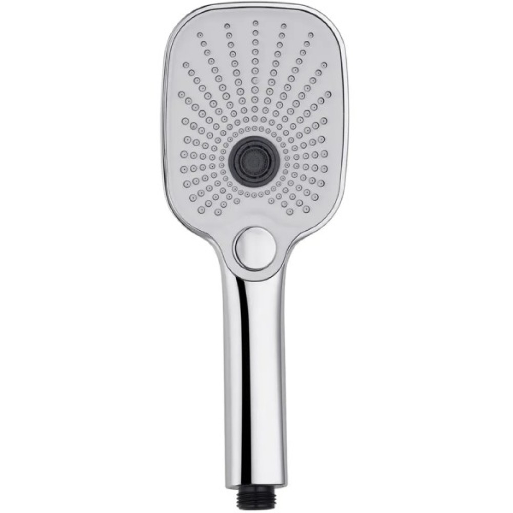 - Прямокутна лійка для ручного душу розміром 100x122 мм із трьома режимами струменя та вбудованим аератором для економії води.