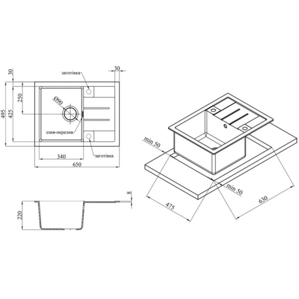 Тип та основні розміри відповідають зазначеним на кресленні, але, зважаючи на особливості виробництва та матеріалів, розміри можуть змінюватись в межах від -3 до -7 мм, тому виріз у стільниці необхідно проводити виключно за наявності мийки. Виробник залишає за собою право вносити зміни до конструкції виробів та комплектації, які не погіршують якість, без попереднього повідомлення.