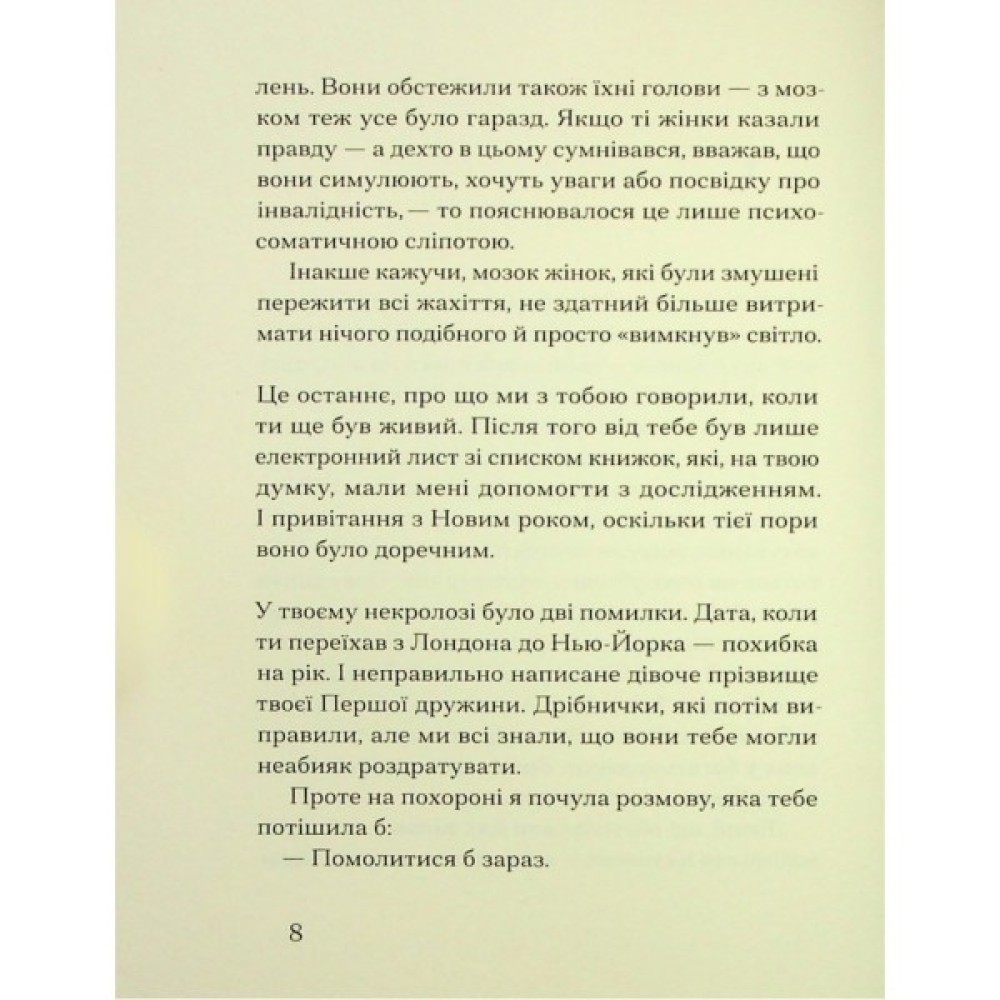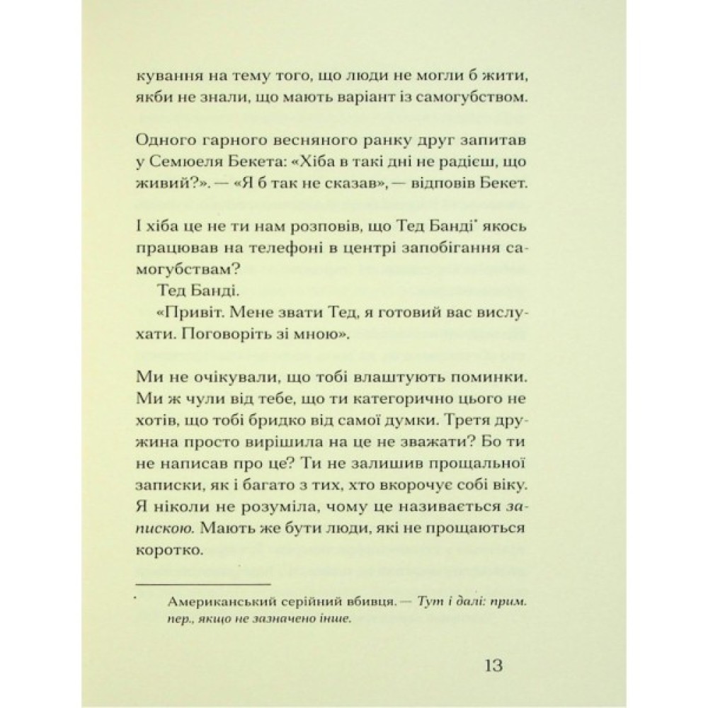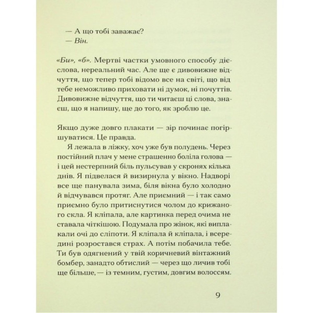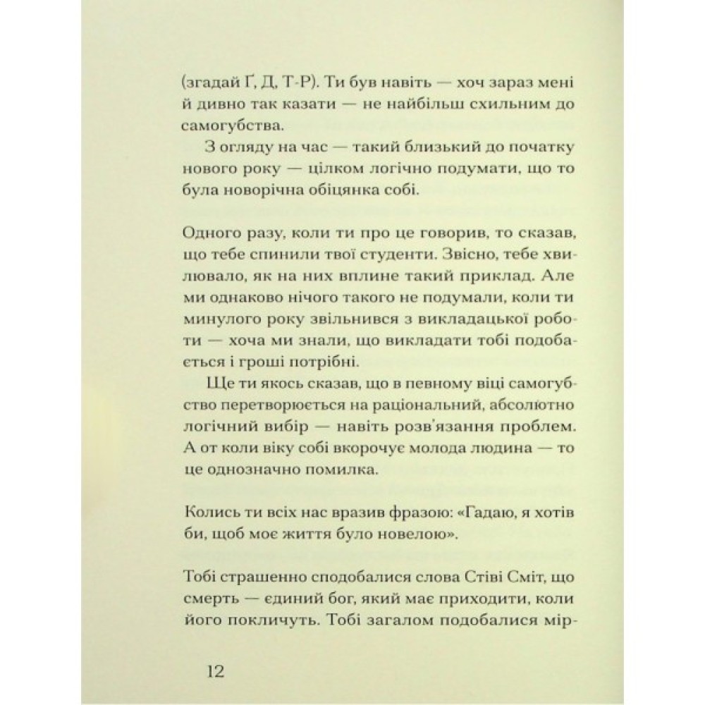 Це чуттєва історія про горювання та прийняття; надзвичайно особистий щемливий лист до друга; пошук відповідей у літературі та вигадливе мереживо думок і подій, де вже й не відрізнити, що — вигадка, а що — реальне життя...