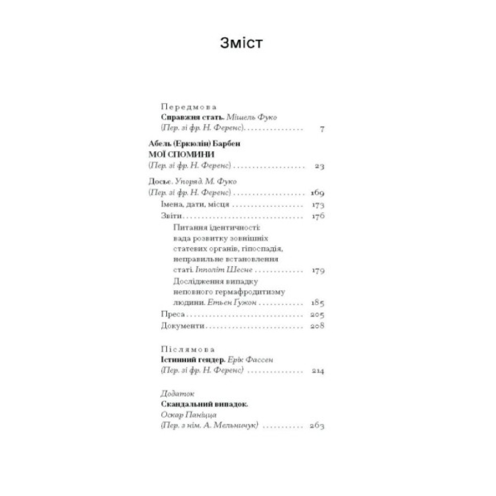 Українське видання містить також повість «Скандальний випадок» німецького лікаря О. Паніцци і післямову Е. Фассена, який підкреслює, як сильно розвиток гендерних студій і руху інтерсекс-людей нині впливають на прочитання цієї оповіді, де Еркюлін / Абель Барбен винаходить собі «справжню стать».
