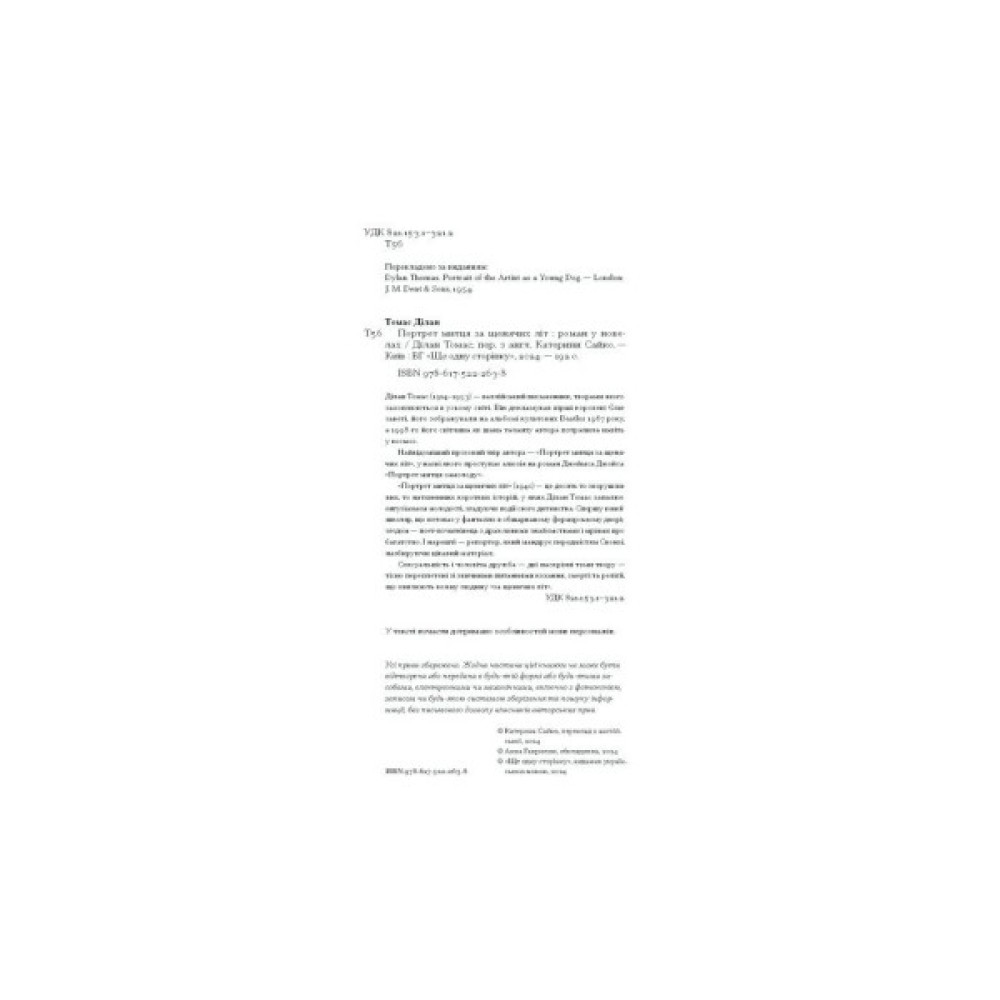 «Портрет митця за щенячих літ» (1940) — це десять то зворушливих, то натхненних коротких історій, у яких Ділан Томас запалює ентузіазмом молодості, згадуючи події свого дитинства. Спершу юний школяр, що потопає у фантазіях в обшарпаному фермерському дворі; згодом — поет-початківець з дражливими знайомствами і мріями про багатство. І нарешті — репортер, який мандрує передмістям Свонзі, назбируючи цікавий матеріал. Сексуальність і чоловіча дружба — дві наскрізні теми твору — тісно переплетені зі звичними питаннями кохання, смерті та релігії, що хвилюють кожну людину «за щенячих літ».
