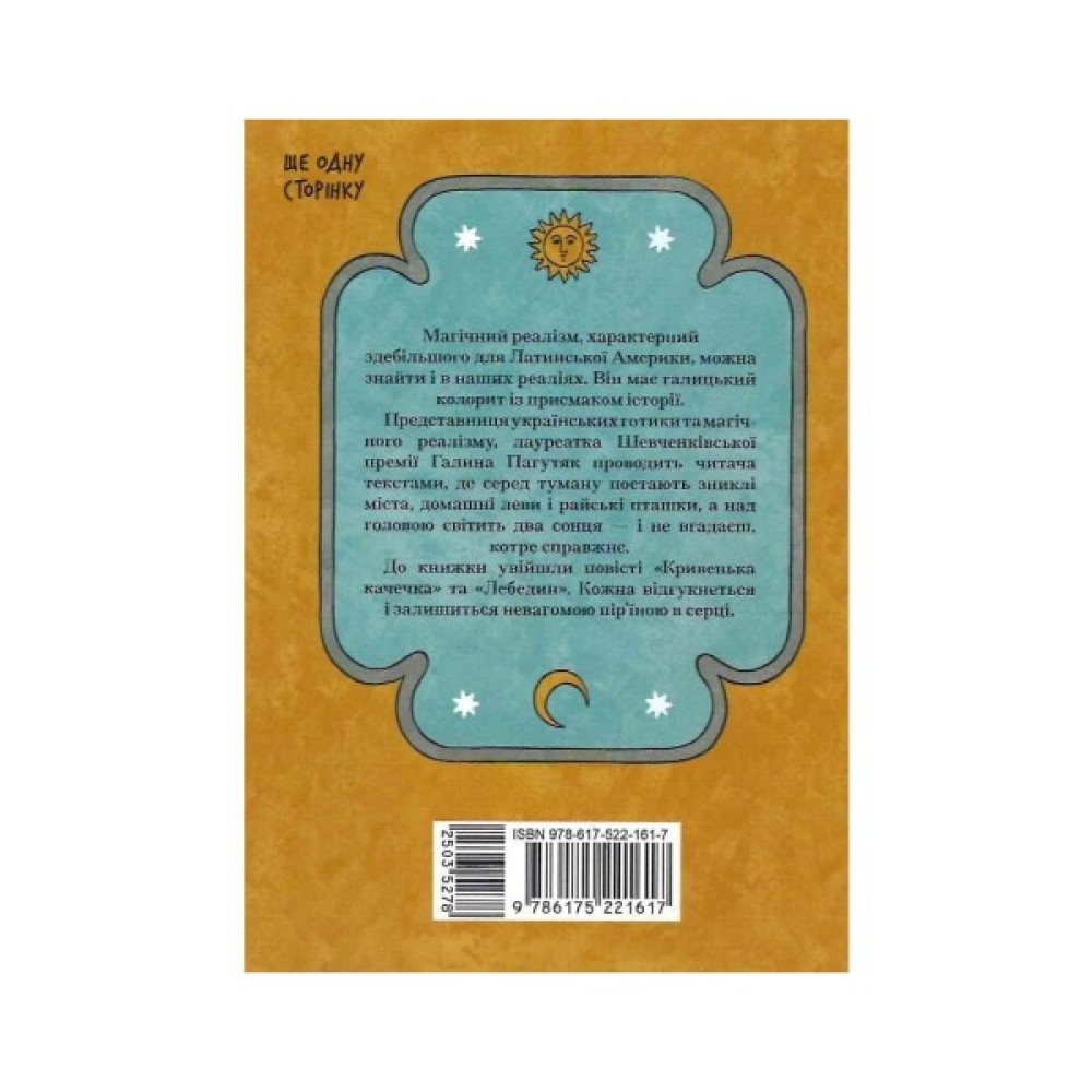 Представниця українських готики та магічного реалізму, лауреатка Шевченківської премії, Галина Пагутяк проводить читача текстами, де серед туману постають зниклі міста, леви і райські пташки, а над головою світить два сонця — і не вгадаєш, котре справжнє.