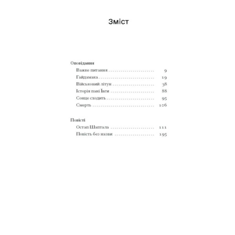 Насолодитися мовою, глибиною образів, авторського стилю можна у добірці, куди входять твори: «Сонце сходить», «Важке питання», «Гайдамака», «Остап Шаптала», «Військовий літун», «Історія пані Ївги», «Смерть» та «Повість без назви...» — останній незавершений твір, який називають унікальним прикладом інтелектуального й психологічного роману в українській літературі XX ст.