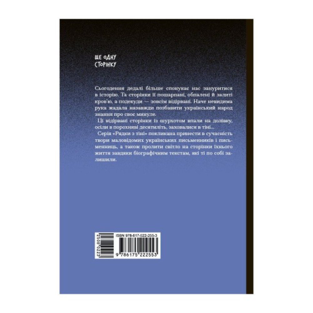 На сторінках цієї книжки вмістилися не лише вибрані оповідання, а й незакінчена повість «Недокурок», досі ніде не видавана, у якій письменниця встигла створити оригінальний психологічний портрет головного героя, хоч і не встигла закінчити його історію. Проте не менш важливу частину книжки становить майже втрачена «Автобіографія» Олени Пчілки— текст, зібраний воєдино з уривків рукописів, машинописів та стародруків, репресованих незадовго по смерті письменниці й розпорошених по темних кутках архівних полиць. Настав час пролити на нього світло.