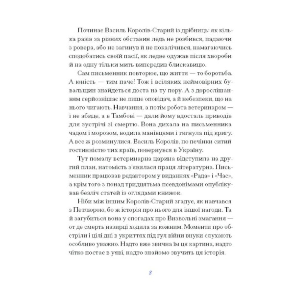 Василь Королів-Старий зміг виїхати в еміграцію і так врятувався від долі своїх репресованих сучасників. Крім того, він заохотив свою дружину Наталену Королеву до творчості, й потім вона навіть перевершила чоловіка у впізнаваності. В еміграції він працював на благо України до останнього подиху, але у спогадах обрав висвітлити не це.