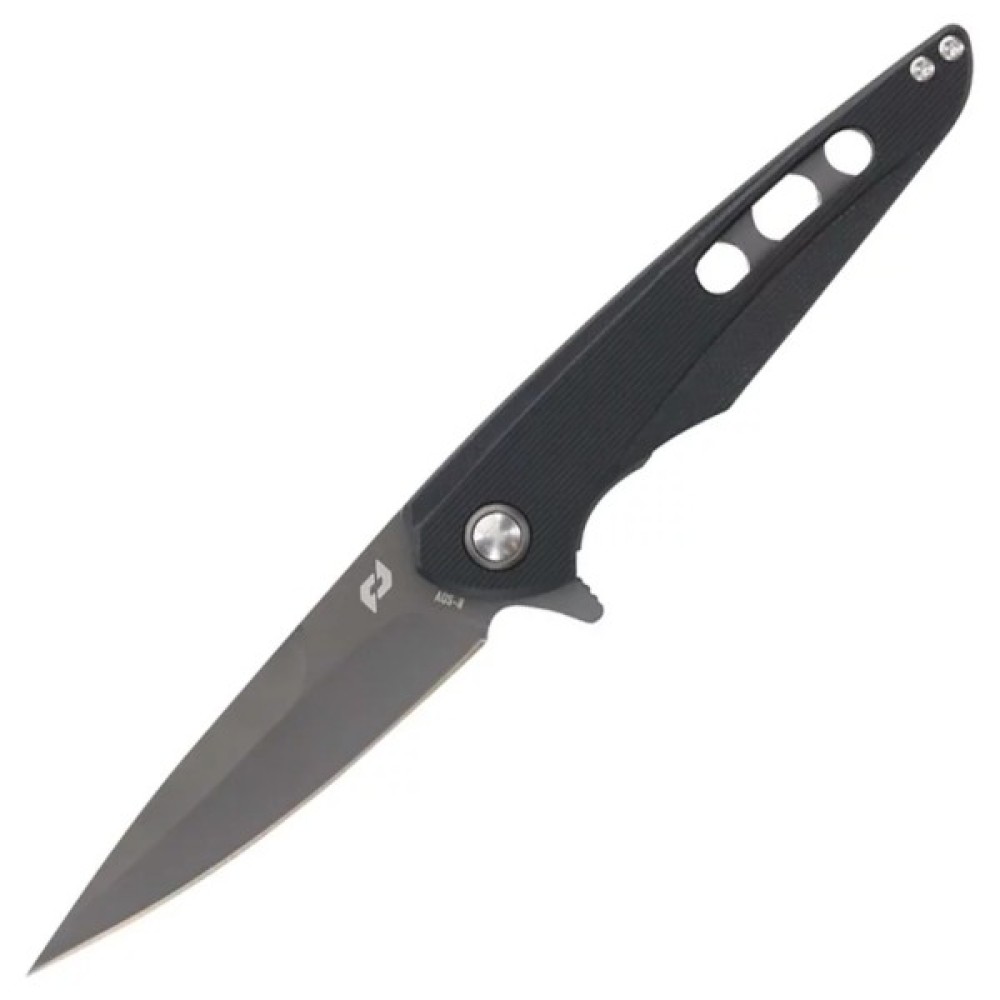 - Оснащений великим і міцним клинком із японської сталі AUS-8 з нітрид-титановим покриттям сірого кольору та прямою ріжучою кромкою