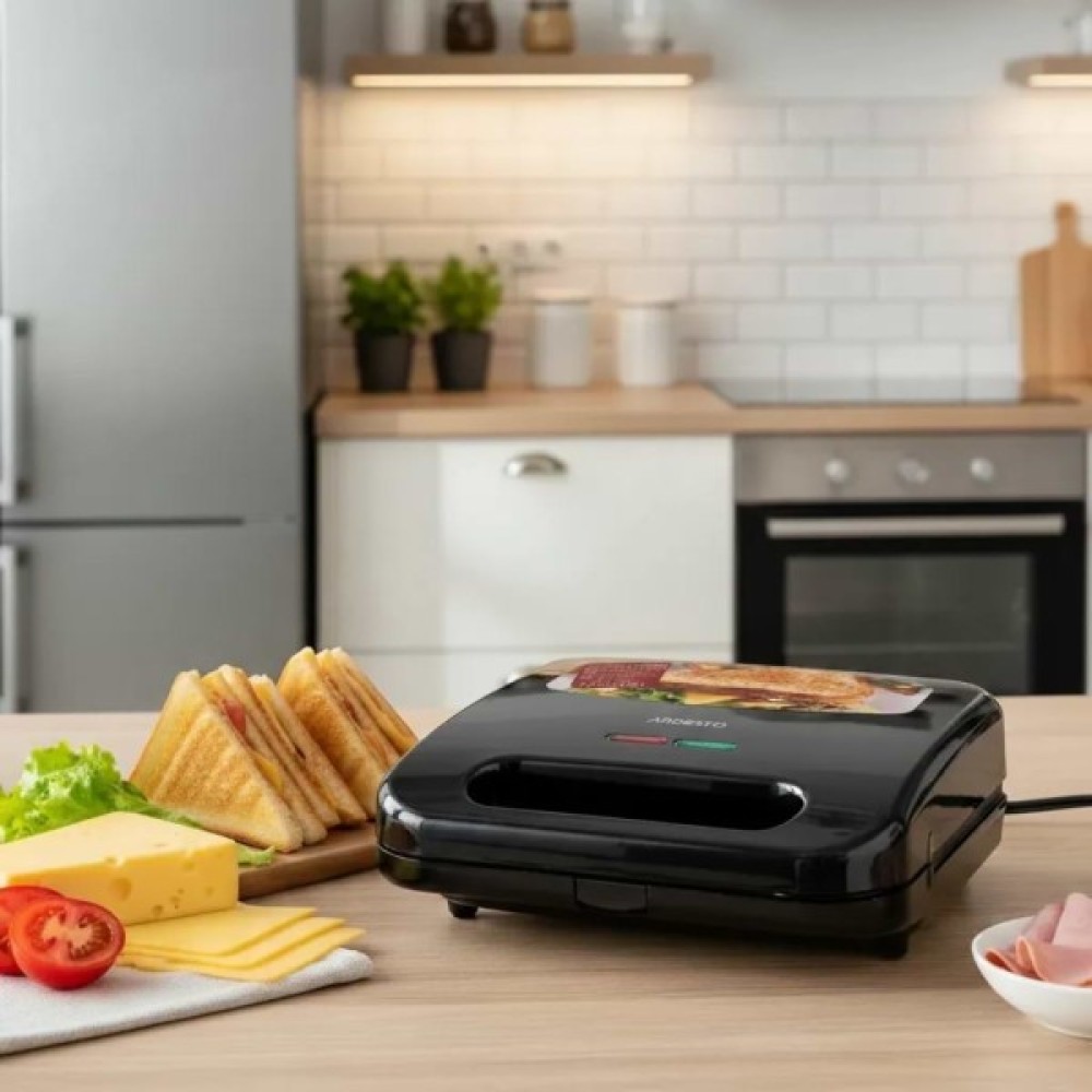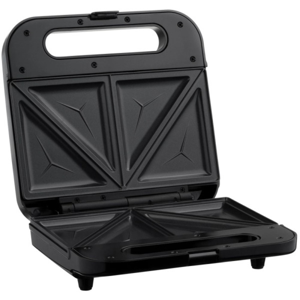 Сендвічмейкер чорного кольору з потужністю 700 Вт та двома пластинами для приготування різноманітних сендвічів.