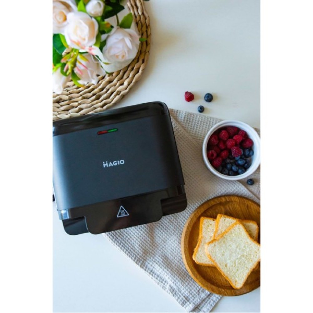 Бутербродниця MG-378 володіє всіма необхідними функціями для того, щоб швидко приготувати смачні та поживні сендвічі. Одночасно в ній можна випікати відразу по 4 сендвічі, краї яких щільно спаюють борти форм, надійно замикаючи начинку всередині. Корпус виготовлений із висококласного термостійкого пластику жовтого кольору. Тип листа - підсмажений сендвіч. Нагрівальний елемент потужністю 750 Вт забезпечить швидке і рівномірне нагрівання двох робочих поверхонь з керамічним покриттям. Бутербродниці Magio дуже зручні у користуванні, сендвічі не пригорають і легко витягуються. Завдяки компактним розмірам та фіксатору бутербродницю зручно зберігати. На кришці є світлові індикатори живлення та готовності до роботи, що полегшує контроль процесу приготування.