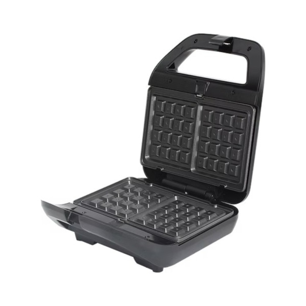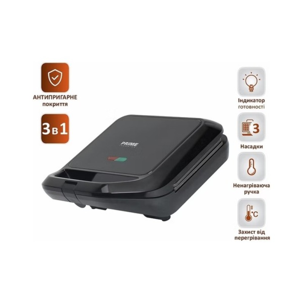 Мультимейкер потужністю 800 Вт оснащений антипригарним покриттям і термоізольованою ручкою. Має індикатори нагріву та готовності, захист від перегріву і підтримує вертикальне зберігання. У комплекті три змінні пластини: для сендвічів, товстих вафель і гриля. Миття в посудомийній машині не передбачено. У наборі також є інструкція та гарантійний талон.