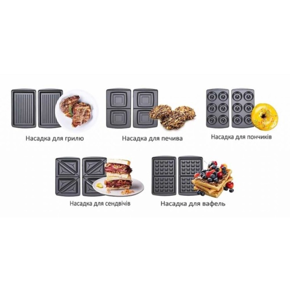 Додаткові функції приготування вафель; приготування грилю; приготування кексів; приготування донатів (пончиків); приготування сендвічів; приготування печива