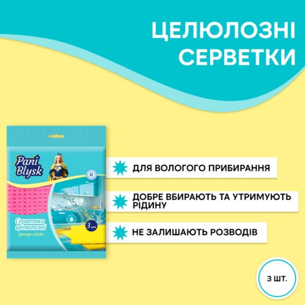 Серветки вологопоглинаючі Pani Blysk виготовлені з целюлози, завдяки чому добре вбирають вологу та утримують рідину. Призначені для всіх видів вологого прибирання. Серветки стійкі до тертя і розривів, зберігають свою форму і розміри. У вологому стані серветка стає м’якою та приємною на дотик, при висиханні твердіє, завдяки чому забезпечується перешкода для розмноження мікробів та неприємних запахів.