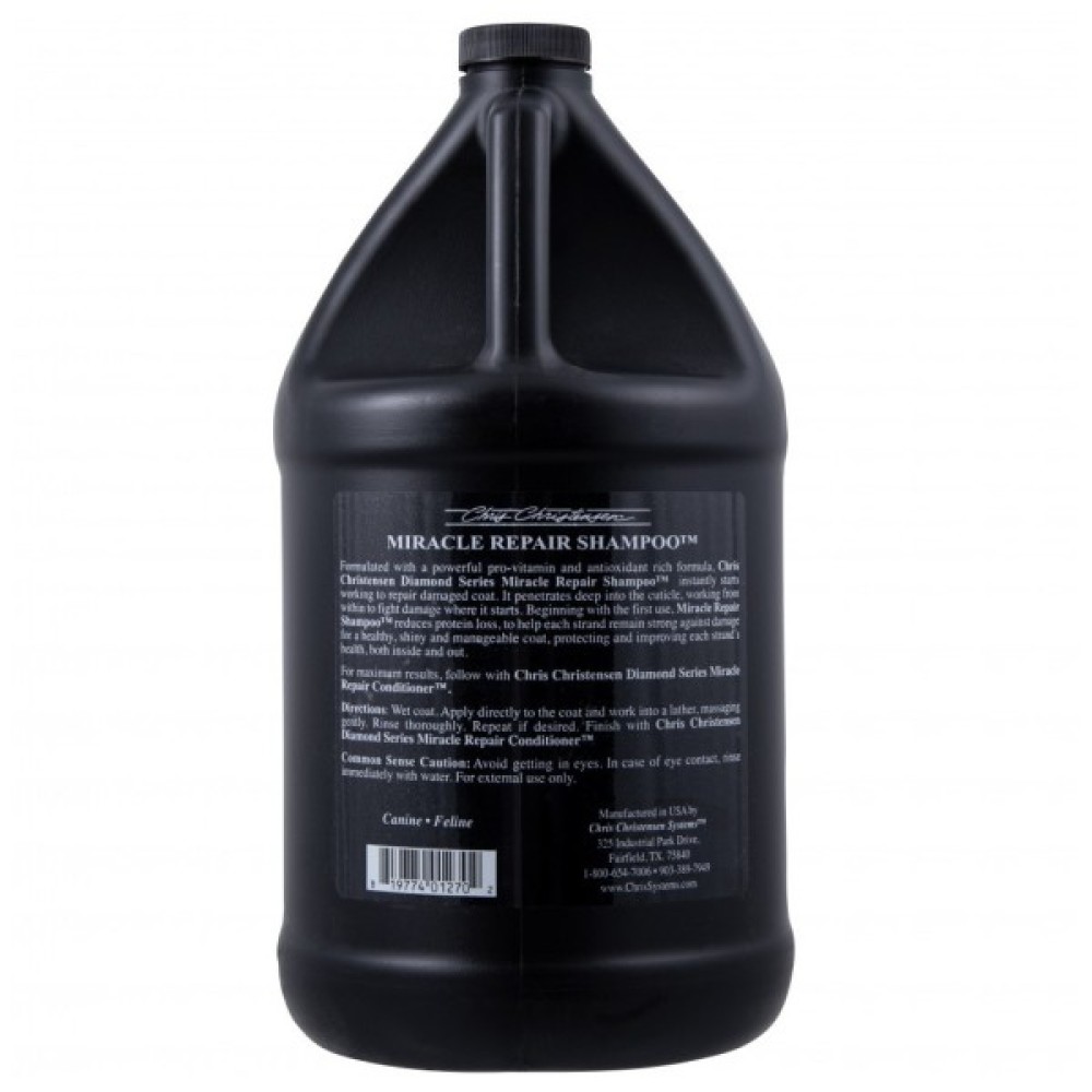 Шампунь Miracle Repair Diamond Series від Chris Christensen для догляду за шерстю. Його формула наповнена антиоксидантами та провітамінами, призначеними для відновлення міцності ламкої шерсті та запобіганню майбутнім ушкодженням, спричиненими доглядом та факторами навколишнього середовища.