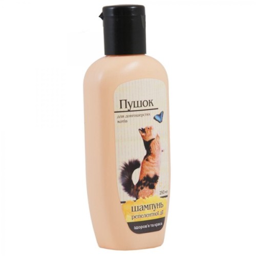 Шампунь репелентної дії. Гігієнічний шампунь для довгошерстих котів «Пушок» має репелентну дію проти бліх, кліщів та інших ектопаразитів. Репелентний ефект досягається завдяки унікальному поєднанню лікарських трав. Шампунь знімає подразнення, пом’якшує та тонізує шкіру, сприяє загоюванню розчосів, надає шерсті здорового блиску та м’якості. Засіб не пересушує шкіру при частому використанні.