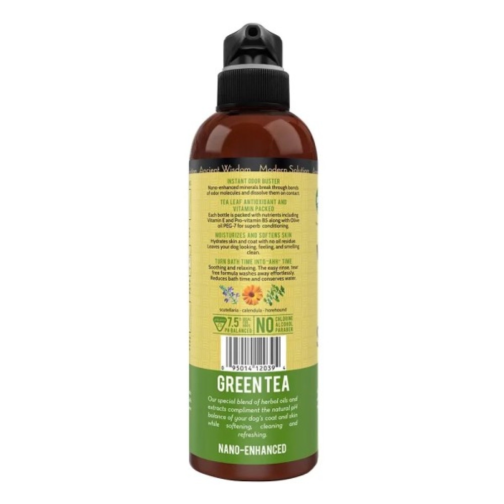 Особлива суміш натуральних вулканічних кварцових мінералів та олія листя зеленого чаю, насичена антиоксидантами, очищує, зволожує, заспокоює та надає сяйва шерсті собак. Не потребує використання кондиціонеру. Натуральна формула «без сліз».