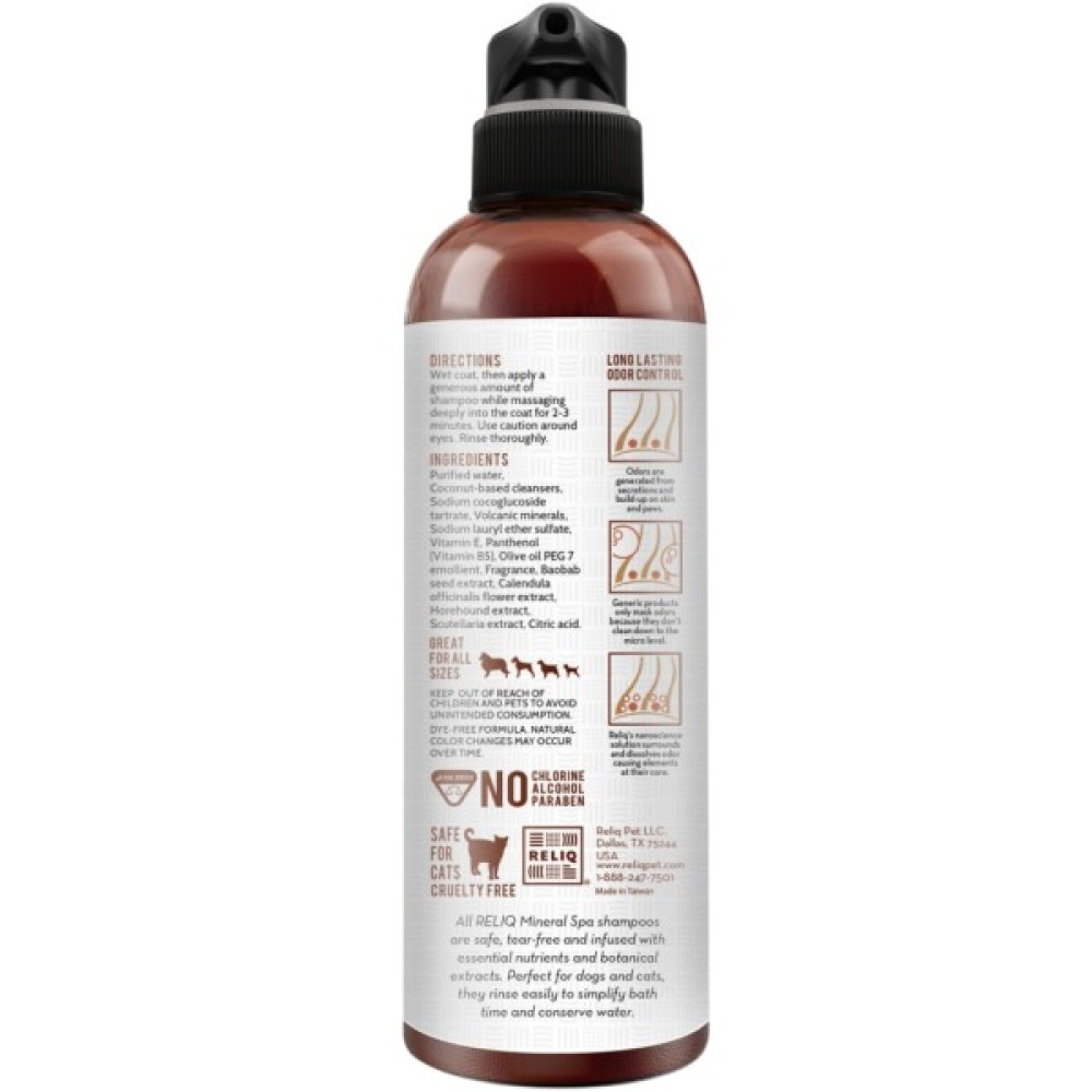 Мінеральна спа косметика RELIQ виготовляється на основі вулканічних мінералів, які сприяють глибокому очищенню та відновленню шкіри. А вітамін Е і провітамін B5 інтенсивно живлять, зволожують і підтримують здоров'я шерсті.
