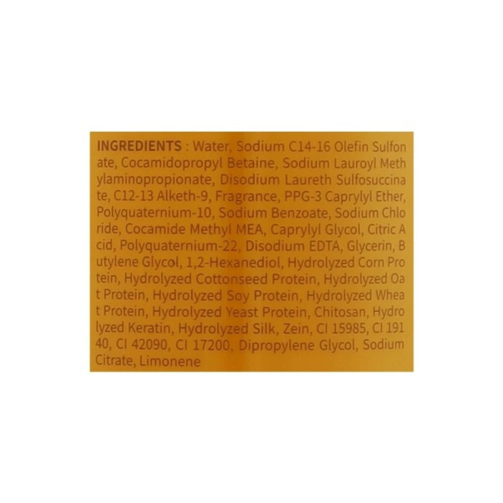 Purified Water, Sodium C14-16 Olefin Sulfonate, Cocamidopropyl Betaine, Sodium Lauroyl Methylaminopropionate, Disodium Laureth Sulfosuccinate, C12-13 Alkenes-9, Fragrance, Ppg-3 Caprylyl Ether, Polyquaternium-10, Mea, Caprylyl Glycol, Citric Acid, Polyquaternium-22, Disodium Edta, Glycerin, Butylene Glycol, 1,2-hexanodiol, Hydrolyzed Corn Protein, Hydrolyzed Cottonseed Protein, Hydrolyzed Oat Protein, Hydrolyzed Hydrolyzed Yeast Protein, Chitosan, Hydrolyzed Keratin, Hydrolyzed Silk, Zein, Yello