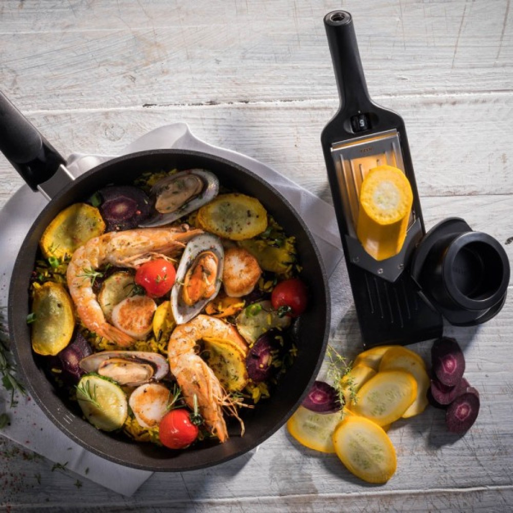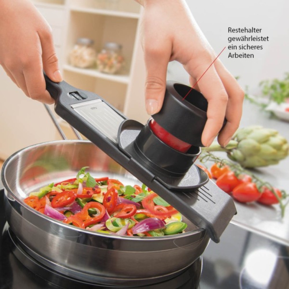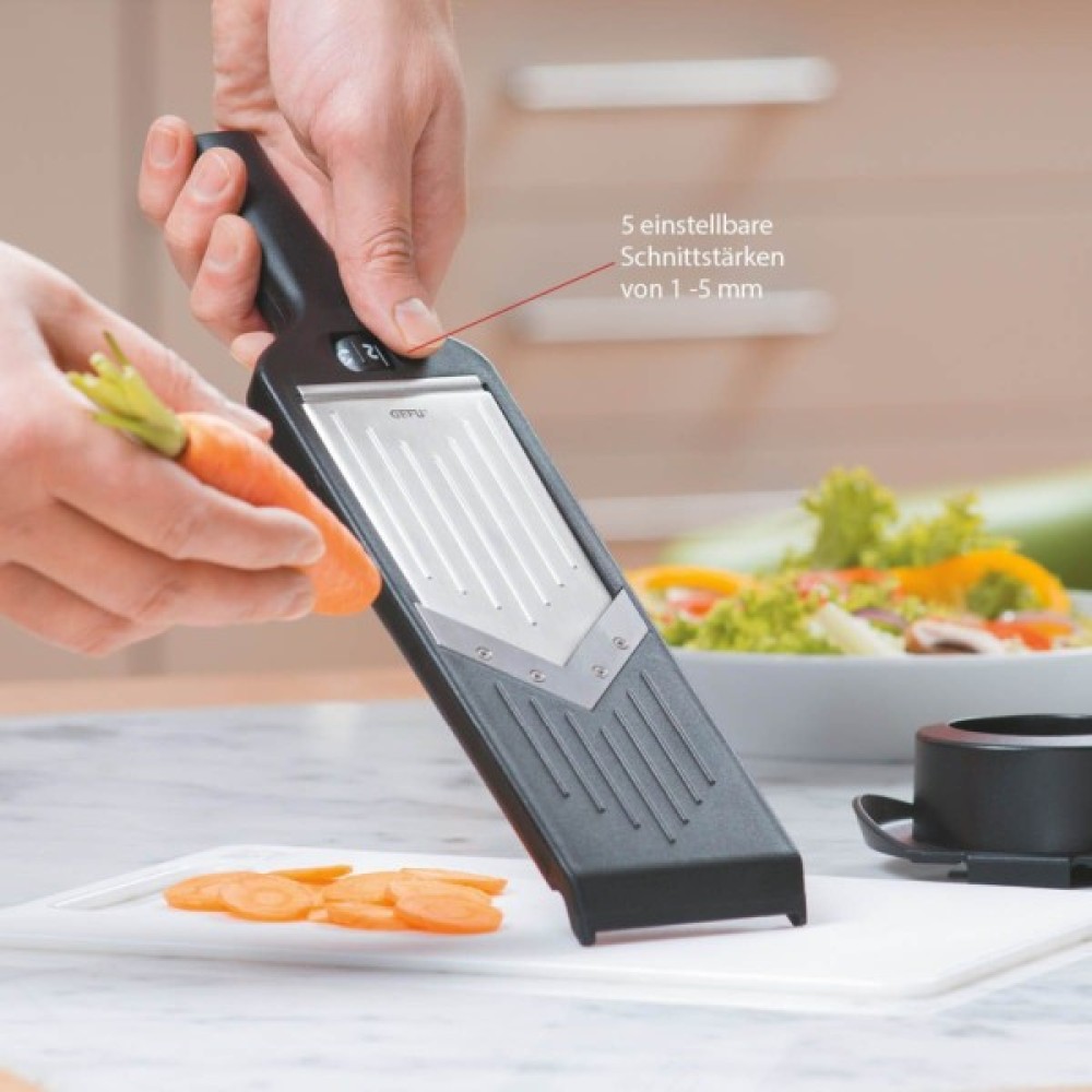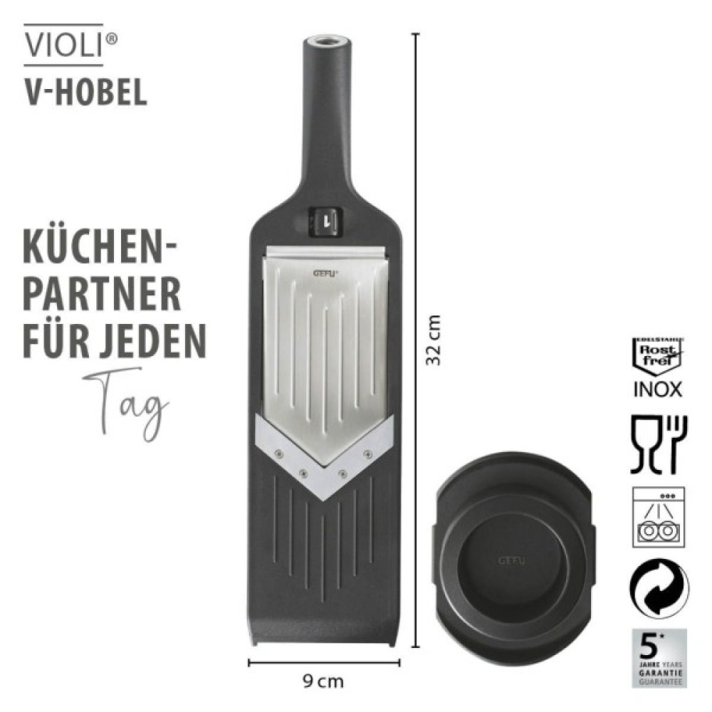 Компактна терка-слайсер Violi від німецького виробника Gefu з неймовірно гострим V-подібним лезом з японської сталі дозволяє миттєво нарізати овочі та фрукти на рівні скибочки. Можна встановити п'ять значень товщини скибочок в діапазоні від 1 до 5 мм, а коли слайсер не використовується, налаштування безпеки запобігає травмам. Нековзкі ніжки забезпечують надійну фіксацію на робочій поверхні, а продумані виїмки на терці фіксують її на краях мисок або каструль. Стильне кільце з нержавіючої сталі, вбудоване в рукоятку, дозволяє підвішувати терку на кухонній рейці.