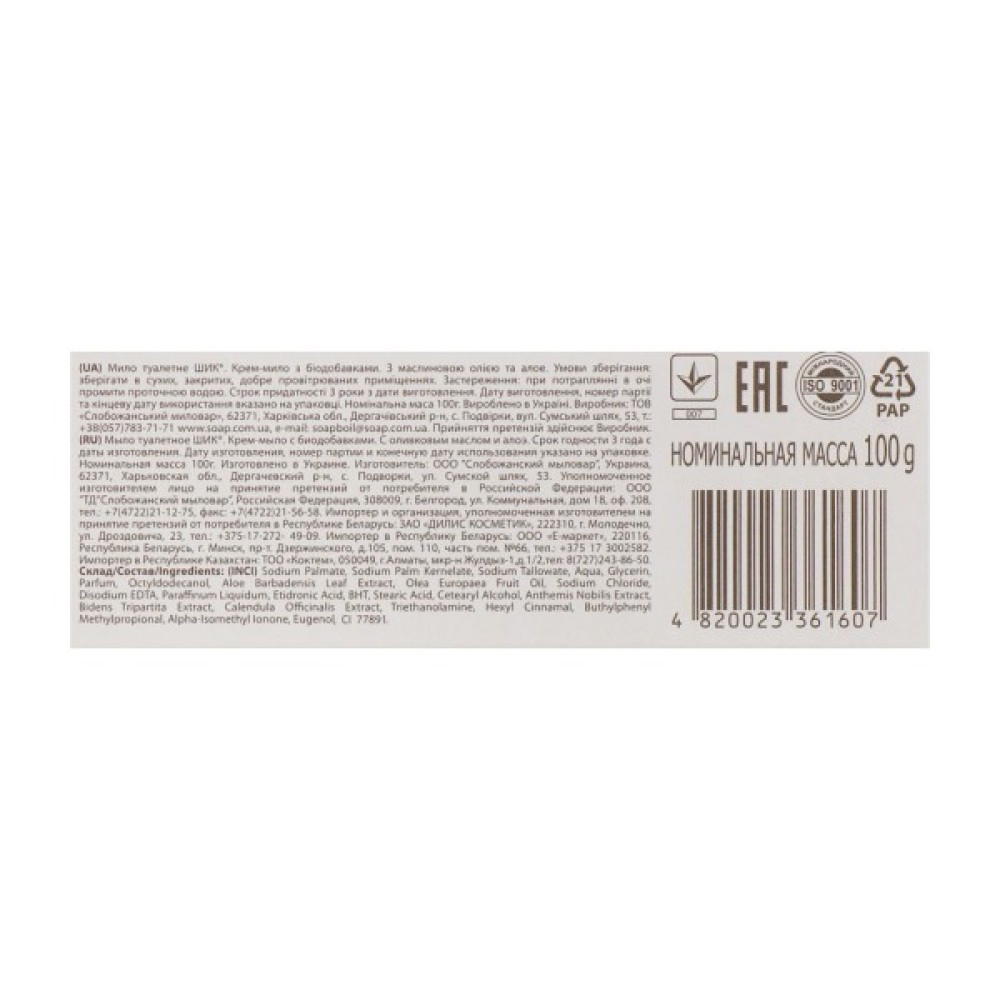Серія делікатного туалетного мила з біодобавками українського бренда «Шик» відкриє перед вами світ приємних і ніжних лазневих ритуалів, після здійснення яких відчуття легкості, комфорту і свіжості супроводжують протягом тривалого часу. Представлений засіб містить корисні натуральні інгредієнти, тому крім якісного очищення забезпечує додатковий доглядовий вплив, надаючи цілющий вплив на шкірний покрив будь-якого типу.