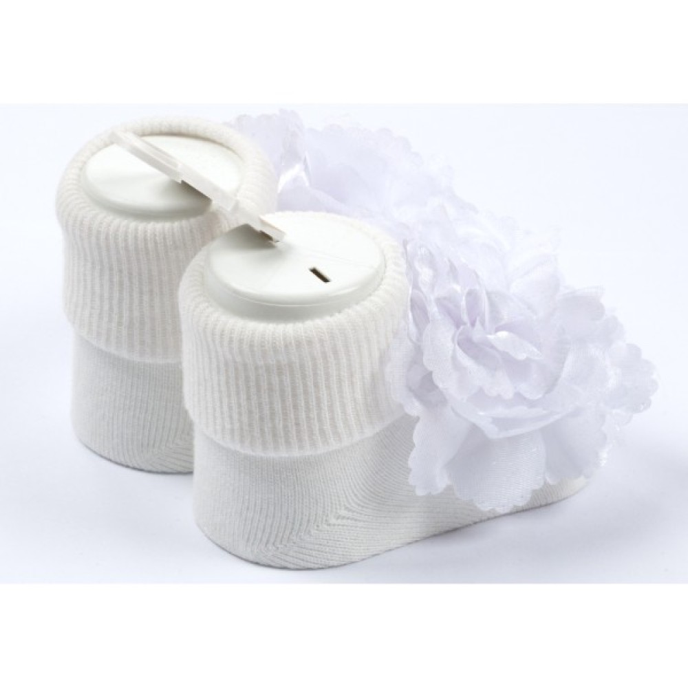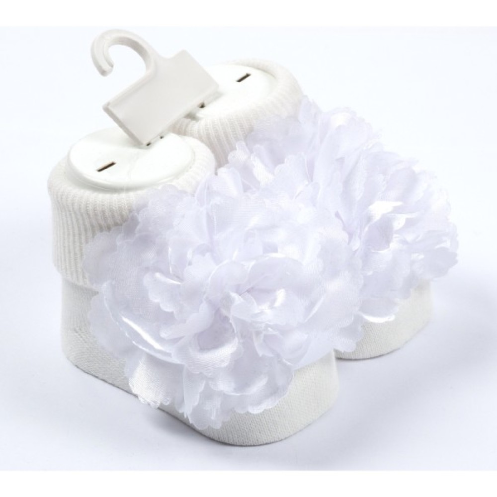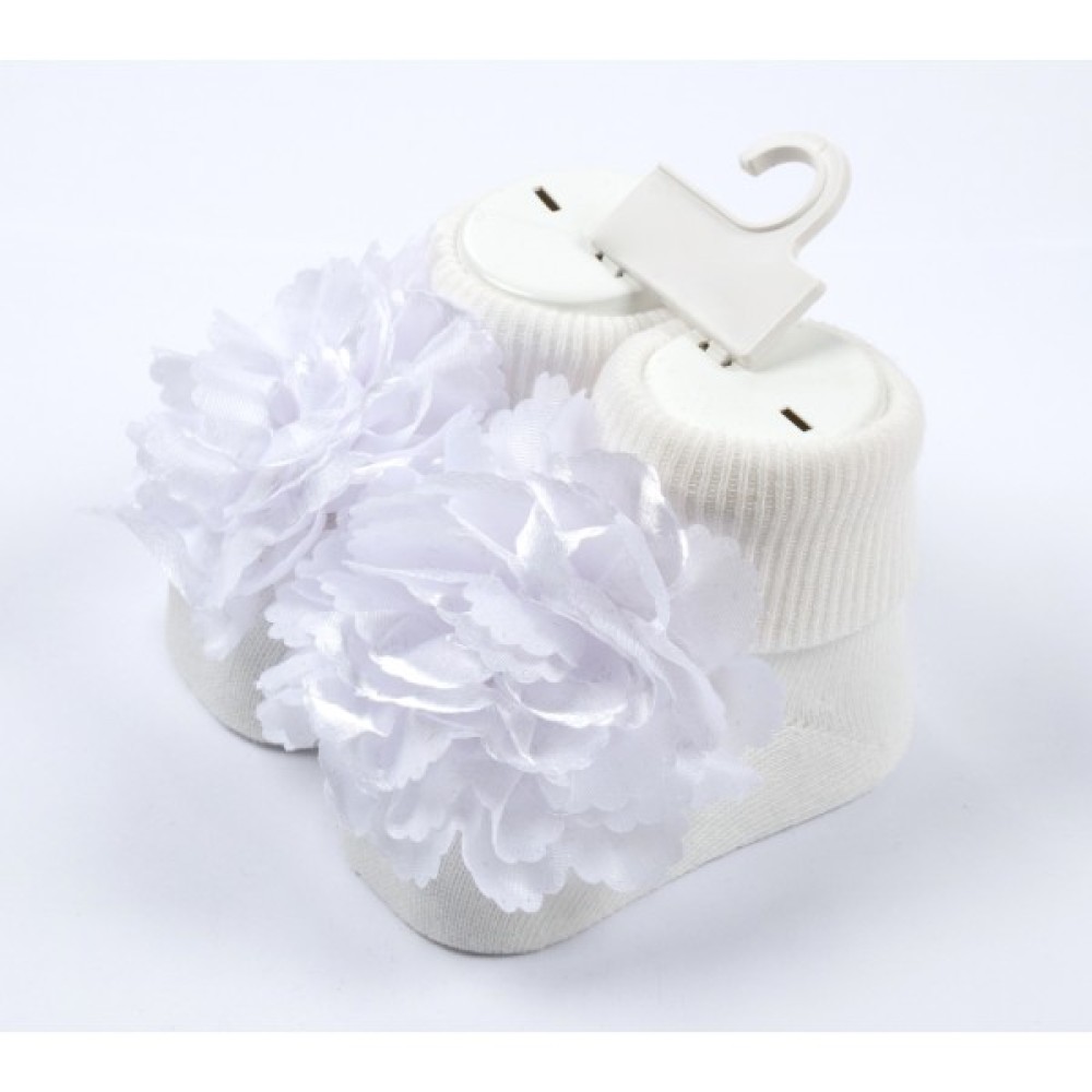 • Дуже ніжні, м'якенькі та приємні на дотик молочно-білі шкарпетки з підворотом та чудовим квітковим декором для малесенької крихітки.