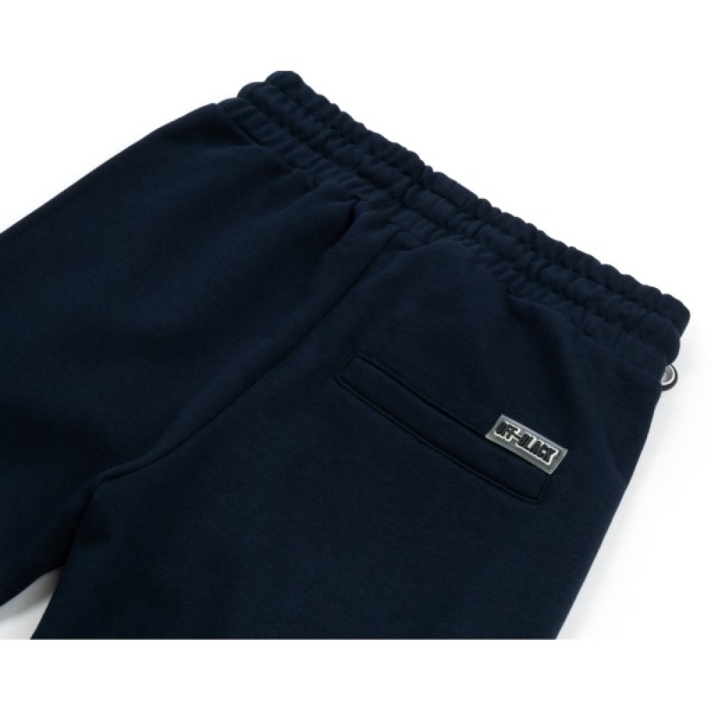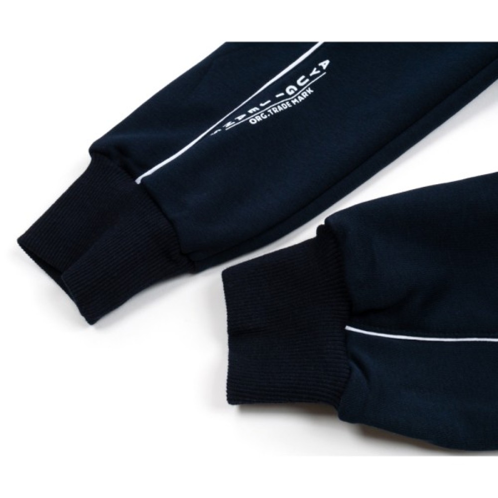 Зручні, стильні спортивні штани на манжетах, прикрашені кантами і принтовими написами, з круглим функціонуючим шнурком в поясі для регулювання об'єму талії, протягнутим через металеві люверси.