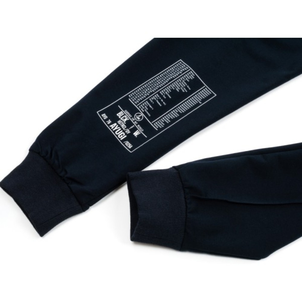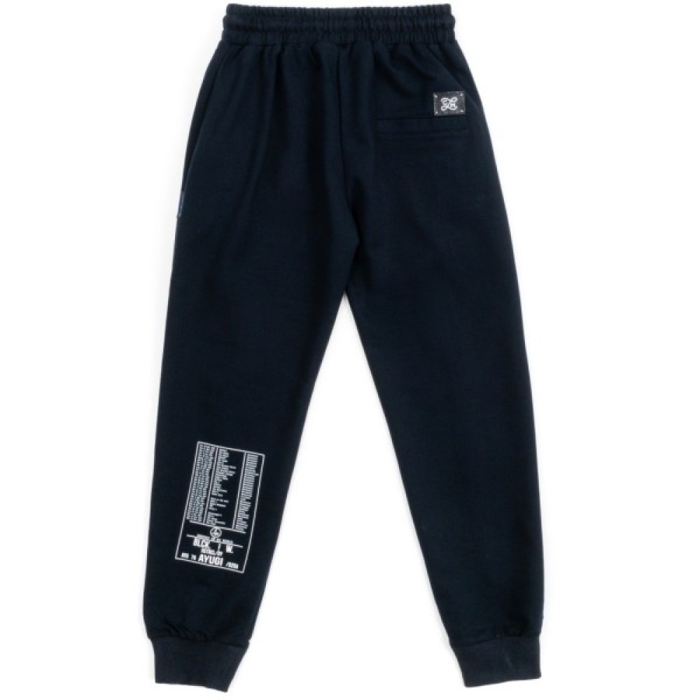 Штани прикрашені фірмовим логотипом A-Yugi. Ззаду на лівій штанині внизу оздоблені принтовими написами.