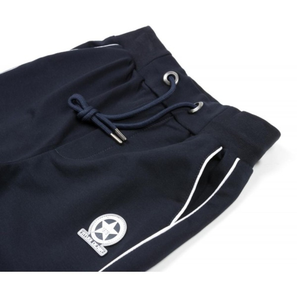 Прикрашені класним настроченим фірмовим гумовим логотипом, а також білосніжними кантами в бічних швах штанів і на входах в передні кишені + фірмова прикраса з невеликим металевим фірмовим логотипом на задній кишені. Спереду дві скошені прорізні кишені, а ззаду - врізна кишеня з лісточкою, на блискавці. Манжети і пояс - з подвійної дуже якісної трикотажної «гумки». В пояс додатково вставлена широка гумка і міцний функціонуючий шнурок. Шнурок, протягнуто в отвори посилені металевими люверсами, які служать ще і додатковою прикрасою.