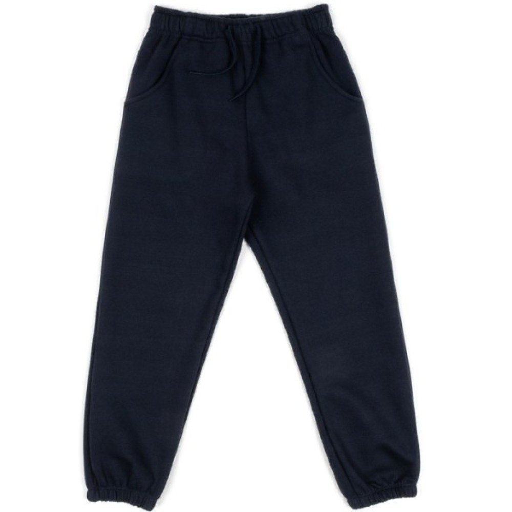 - Зручні, вільні однотонні спортивні штани для хлопчика, утеплені флісовим начосом, під гумку в поясі та по низу, без зайвих прикрас.
