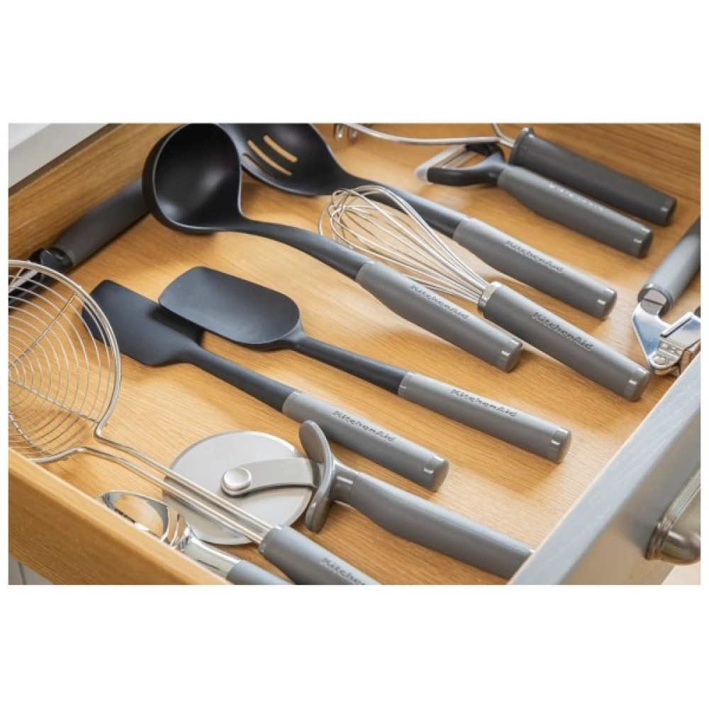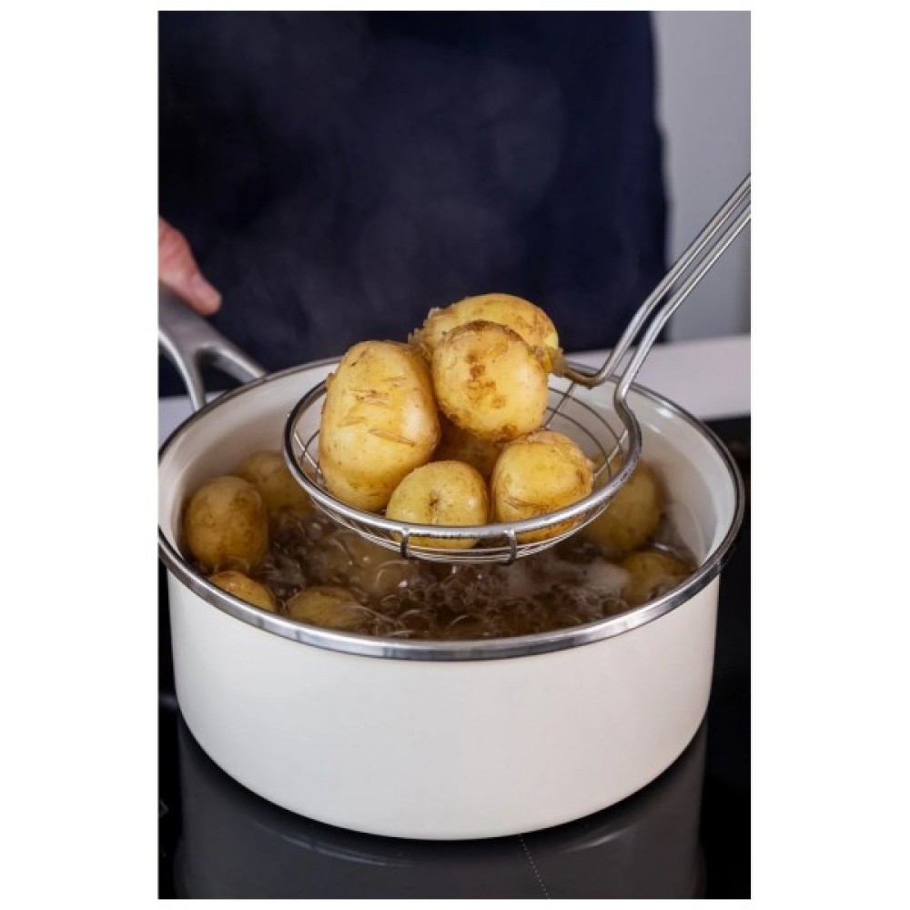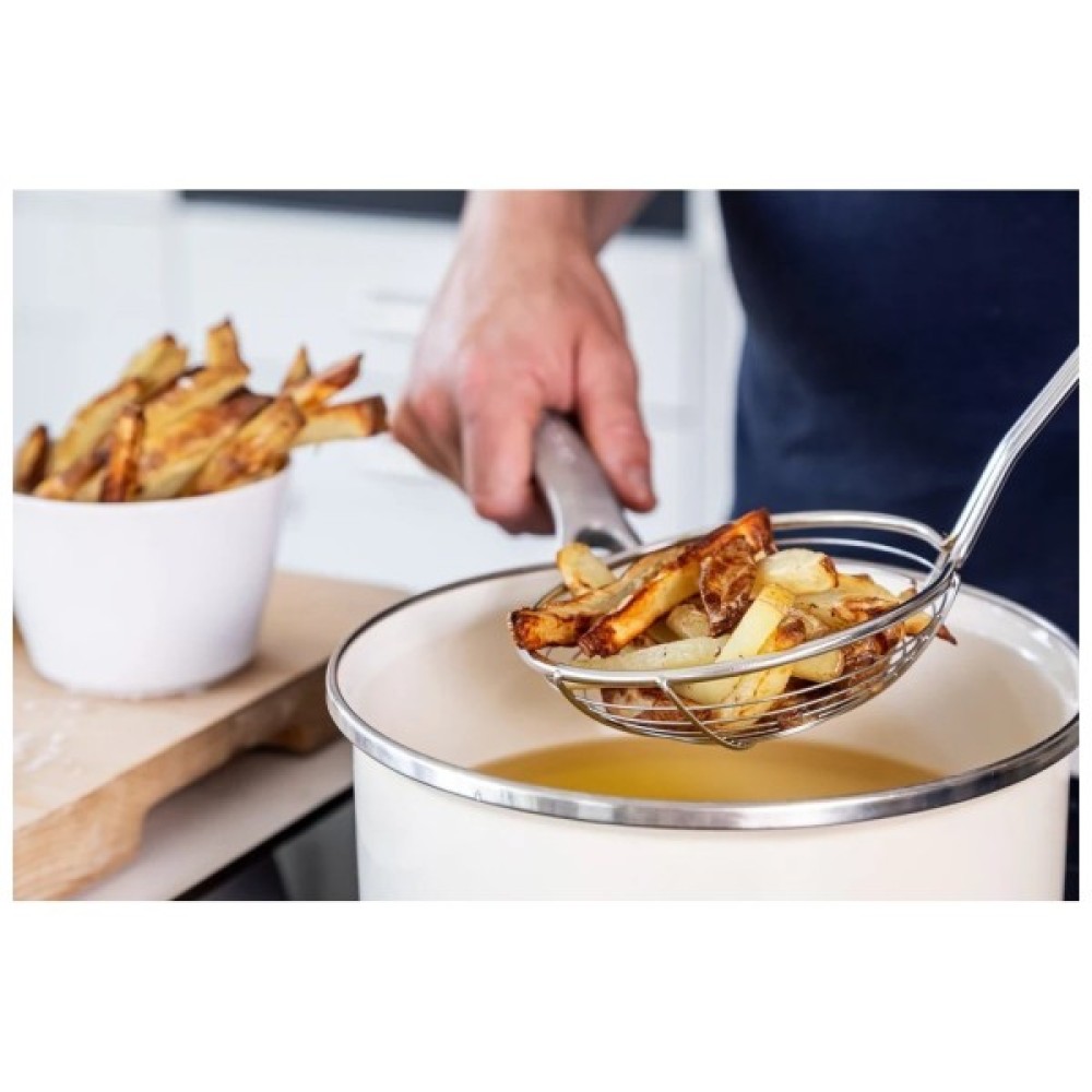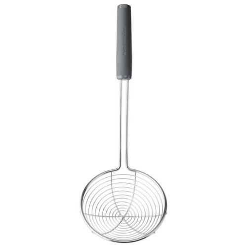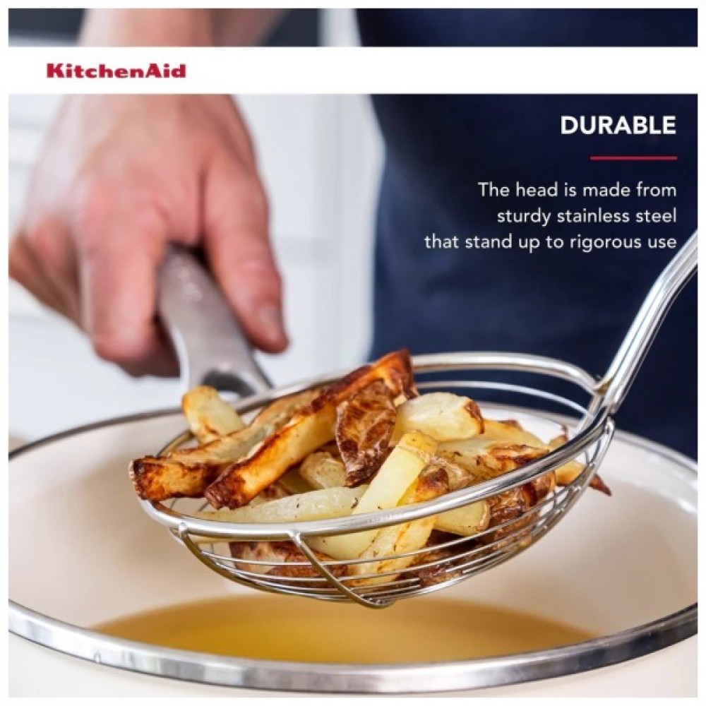 Ця універсальна шумівка KitchenAid легко зачерпує пельмені. Надзвичайно широкий кошик з нержавіючої сталі дозволяє рідині швидко стікати, що робить його чудовим інструментом для смаження у фритюрі. Головка сита виготовлена з міцної, стійкої до іржі нержавіючої сталі. М'яка ручка з рельєфним логотипом, яку можна мити в посудомийній машині для легкого очищення.