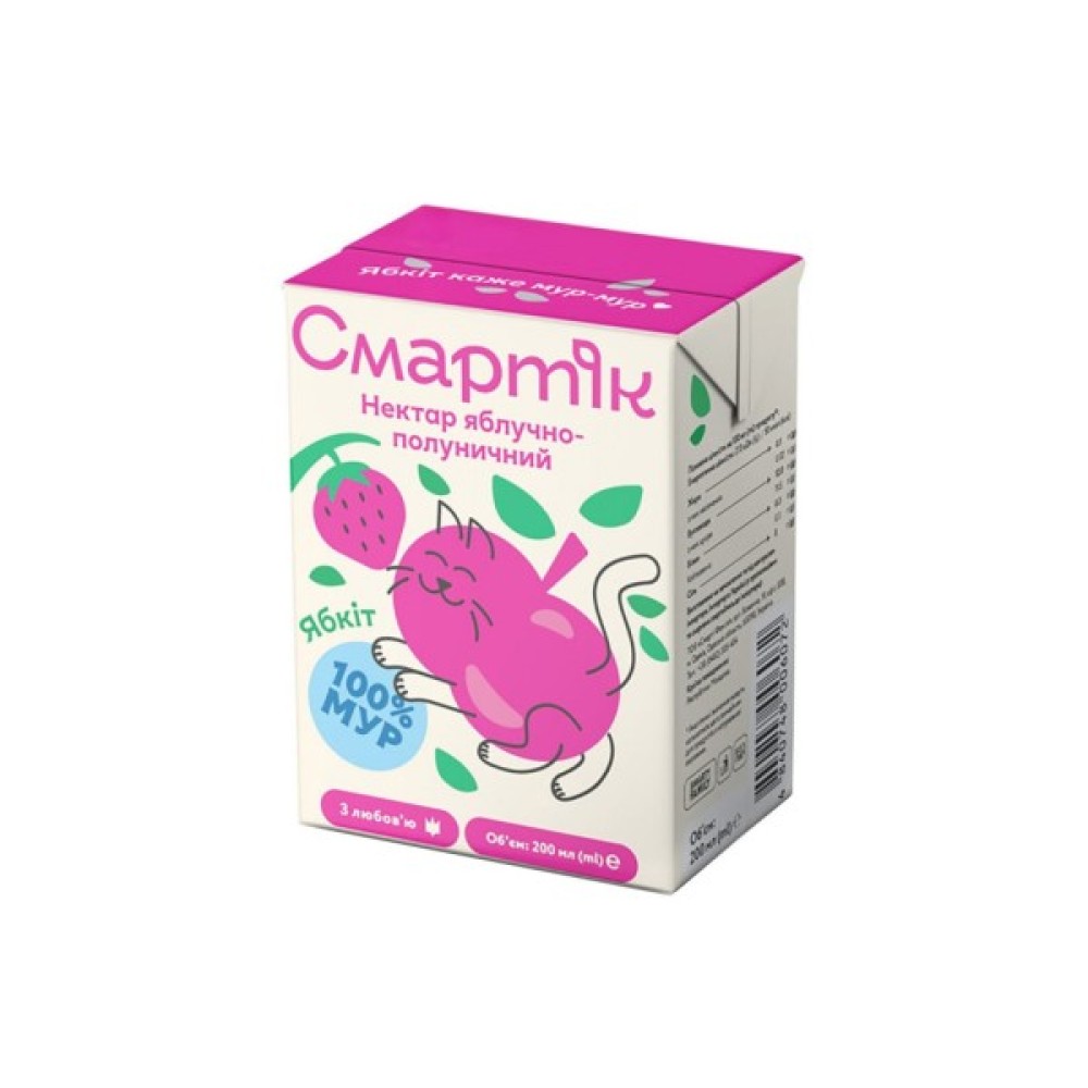 МУР-МУР, мене легко впізнати по рожевій верхівці на пакеті. Я обожнюю фрукти і завжди насолоджуюся їх смаком і запахом, радісно посміхаюся і голосно муркочу. Я великий трудівник: адже влітку збирав і готував фрукти. Також я старанний мандрівник: мандрував різними країнами і вибирав найкращі фрукти для яблучно-полуничного нектару. Нектар Смартік яблучно-полуничний з м'якоттю 200 мл – особливо смачний, адже він виготовлений за унікальною технологією з найкращих соковитих ягід та стиглих плодів. Має натуральний смак та насичений колір. Яблуко ділиться з нами залізом, фруктовими кислотами та вітамінами А, В, С, цинком, фосфором та органічними кислотами (яблучна та саліцилова), а також клітковиною та пектинами.