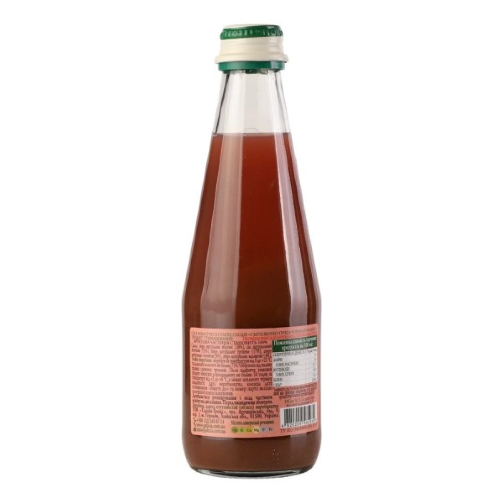 Склад сік яблучний (35%), пюре яблучне (32%), пюре грушеве (20%), пюре чорничне (8%), пюре малинове (5%)