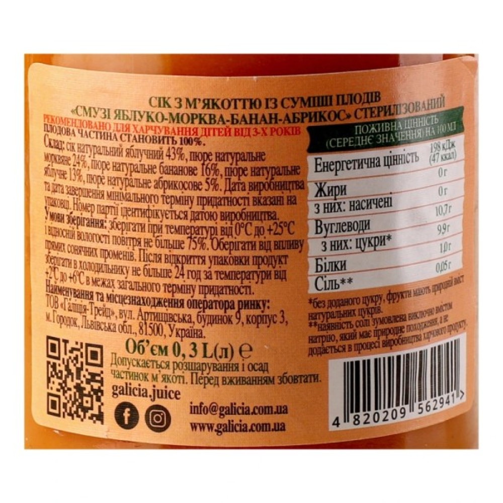 Сік, Galicia, Смузі, яблуко, морква, банан, й, абрикос, 300, мл, сб, 4820209562941