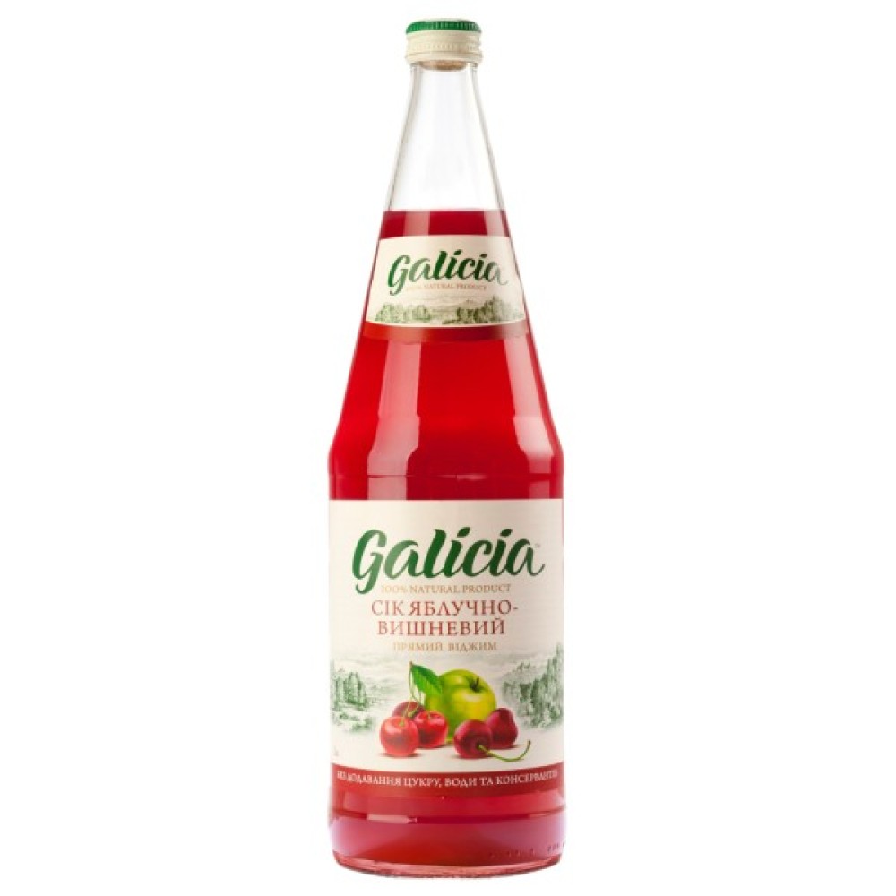 Сік Galicia яблучно-вишневий - солодкі яблука у поєднанні з приємною кислинкою вишень утворюють оригінальний смак, що освіжає. Цей сік - справжній еліксир молодості, адже властивості яблука, що очищають, посилюються антиоксидантною дією вишні та запобігають передчасному старінню.