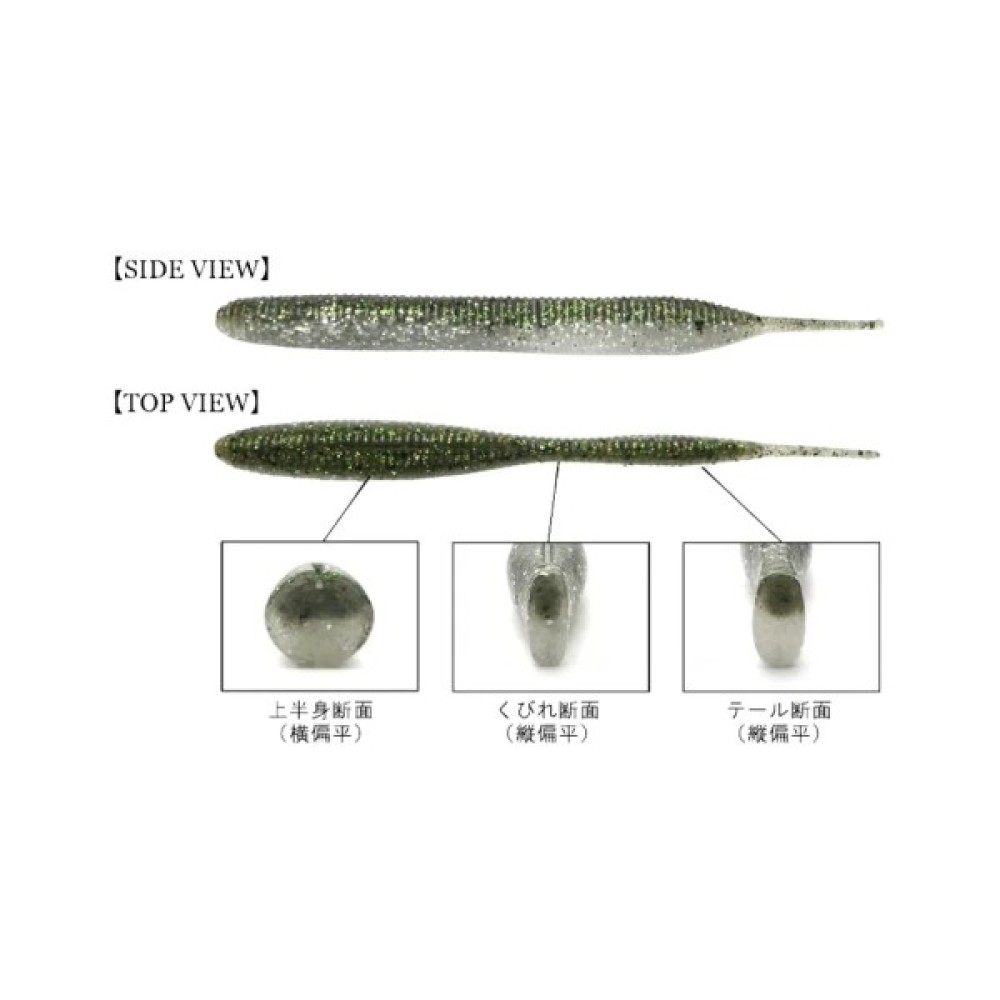Силікон Keitech Sexy Impact – дуже оригінальна приманка типу слаг. Тіло приманки має складну форму: круглу у передній частині, уплощення у вертикальній площині, а задня частина закінчується довгим, тонким і дуже рухливим хвостиком. Зверху знаходиться спеціальна виїмка для офсетного гачка. Тіло приманки зроблено з двох видів силікону для кращого балансу – зверху більш легкий(без солі), знизу – більш важкий(з сіллю).