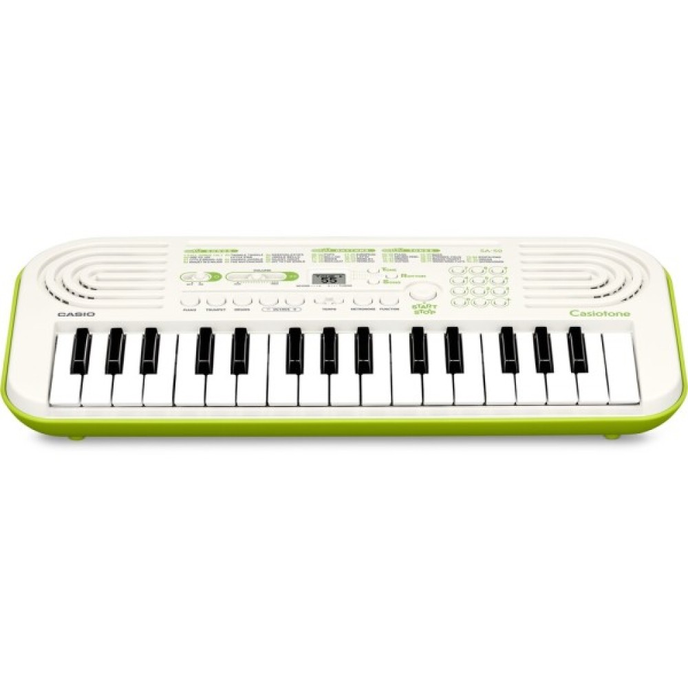 CASIO SA-50 – синтезатор із мініклавішами для маленьких музикантів. Модель має 100 тембрів, 50 ритмів та 10 вбудованих творів для навчання.