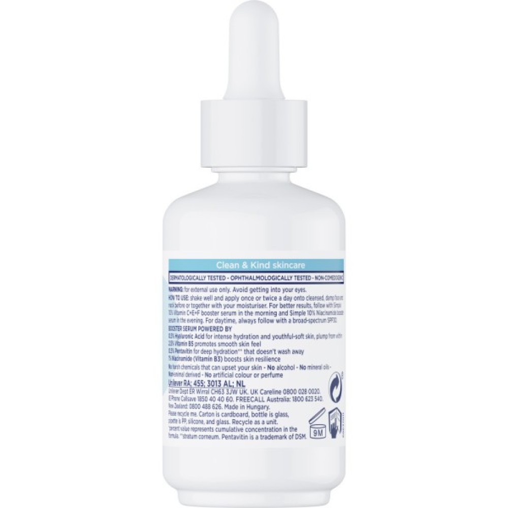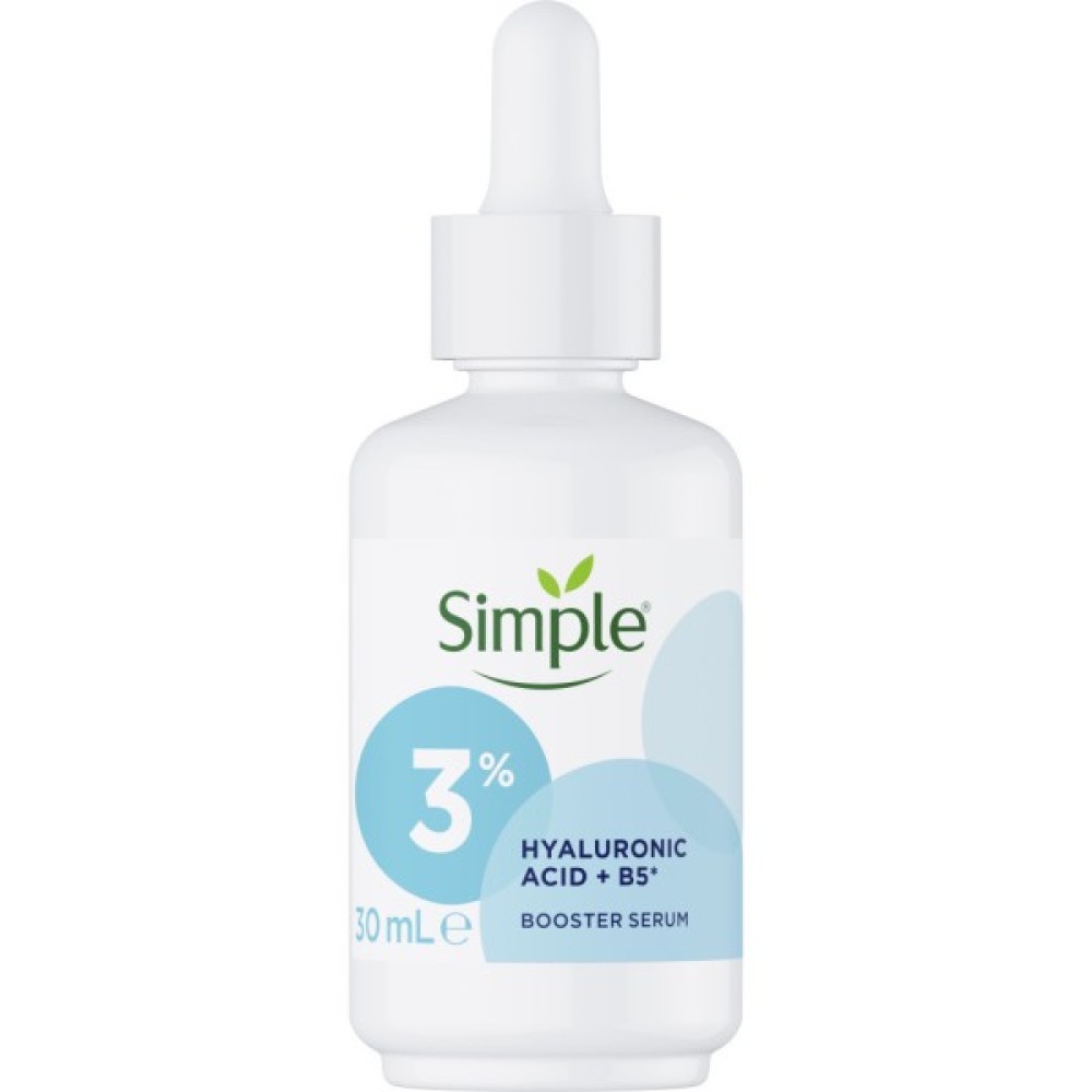 Сироватка Simple Гіалуронова кислота + Вітаміни В5 посилена: 0.5% гіалуронової кислоти - для інтенсивного зволоження та отримання м’якої шкіри, пружної зсередини; 2.5% Вітаміну B5 - сприяє гладкості шкіри; 0.5% пентавітину - для глибокого зволоження**, яке не змивається; 1% Ніацинаміду (Вітамін В3) - підвищує пружність шкіри.