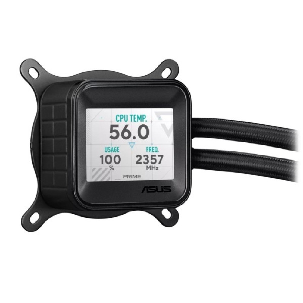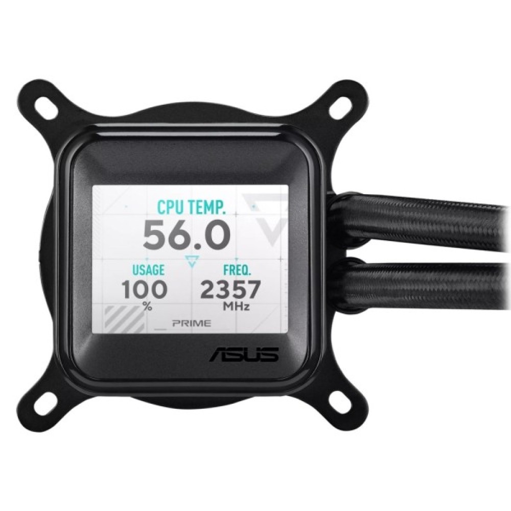 Універсальний рідинний кулер Asus Prime LC ARGB LCD з чітким екраном, на якому відображається інформація про процесор і графічний процесор з різним фоном, високопродуктивна помпа Asetek з надійним двигуном і послідовним з'єднанням вентиляторів.