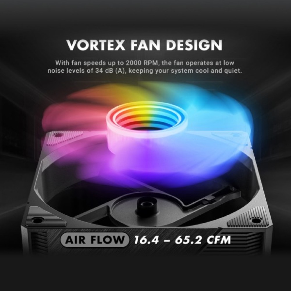 Конструкція вихрового вентилятораЗі швидкістю обертання до 2000 об/хв вентилятор працює з низьким рівнем шуму 34 дБ(А), забезпечуючи прохолоду та тишу у вашій системі.