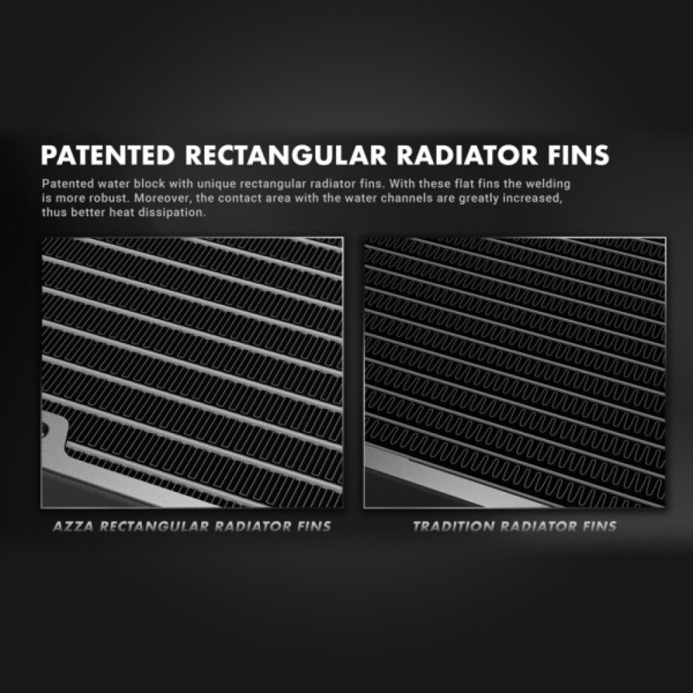 Запатентовані прямокутні ребра радіатораЗапатентований водяний блок з унікальними прямокутними ребрами радіатора. Завдяки цим пласким ребрам зварювання є більш міцним. Крім того, площа контакту з водяними каналами значно збільшена, що сприяє кращому розсіюванню тепла.