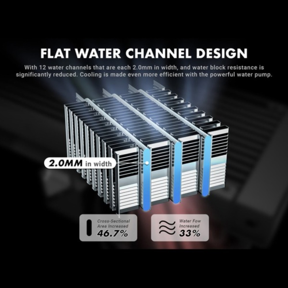 Плаский дизайн водяних каналівЗавдяки 12 водяним каналам, кожен з яких має ширину 2,0 мм, опір водяного блоку значно зменшується. Охолодження стає ще більш ефективним завдяки потужному водяному насосу.