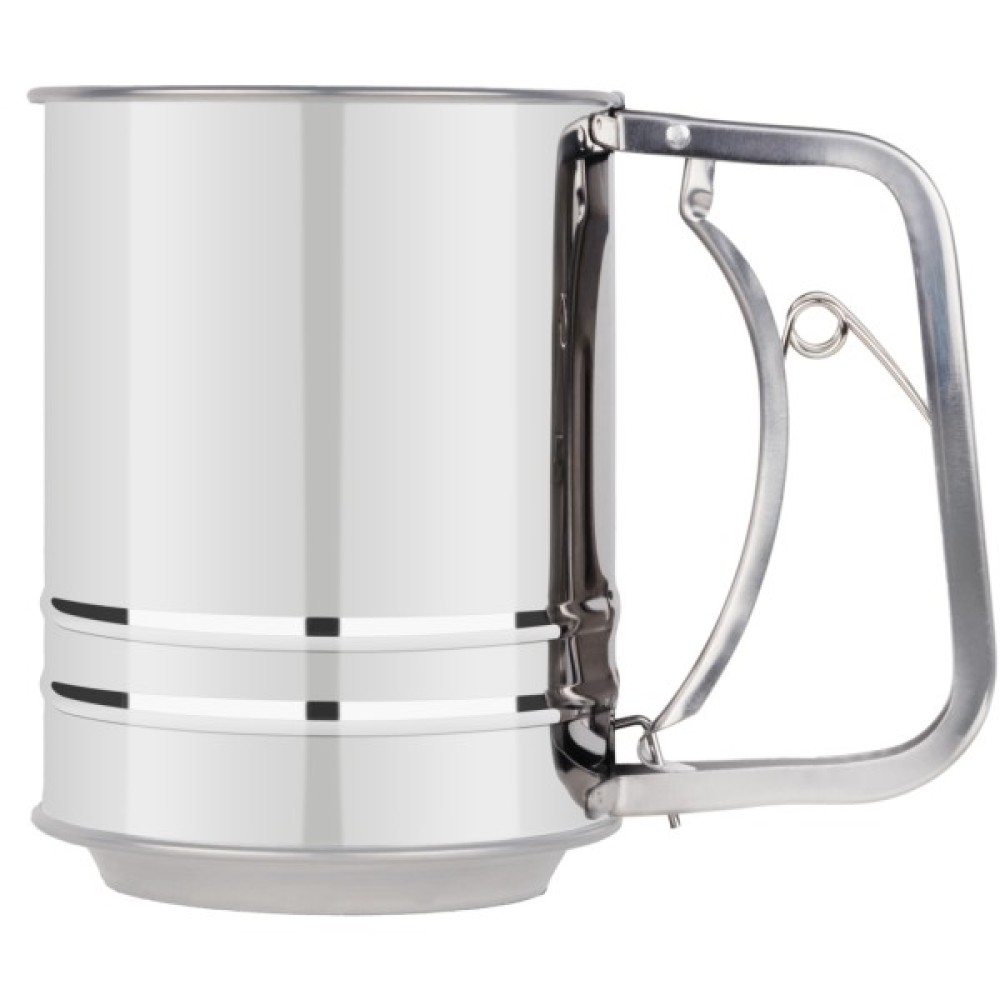 Ручний просіювач борошна серії Havel торгової марки Ringel вироблений із якісної нержавіючої сталі – незамінний аксесуар для любителів готувати випічку та різні десерти. На ручці кухля-просіювача розміщується клапан, який потрібно натискати, щоб привести до дії металеві лопаті на дні просіювача. Вони протирають борошно через дрібні осередки дна кухля, ефективно розбиваючи найменші грудочки, насичуючи киснем і видаляючи сторонні частинки, які залишаться в кухлі.