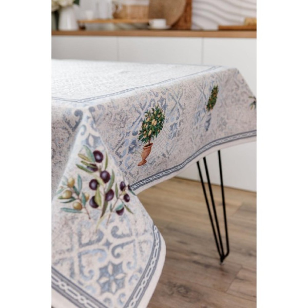 Скатертина на стіл з високоякісної гобеленової іспанської тканини. Це стильний подарунок сім'ї, друзям, родичам та колегам на будь-яку подію. Також це чудове доповнення до серветок, фартухів, рукавичок, прихваток, доріжок, наволочок та подушок з гобеленової колекції Наполі. Склад тканини: 34% бавовна, 63% поліестер, 3% акрил (гобелен). Виробництво: Україна.