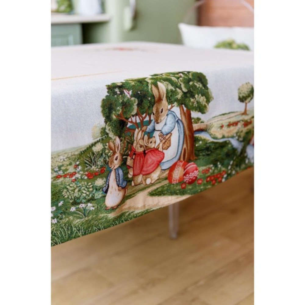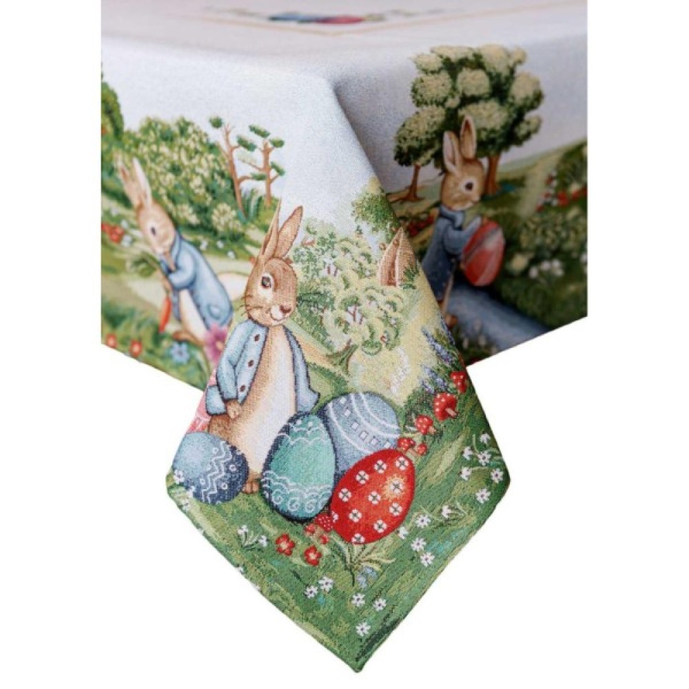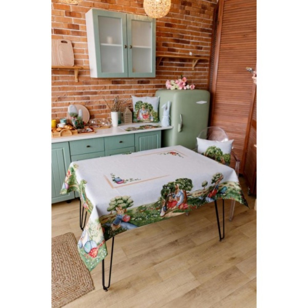 Скатертина на стіл із гобеленової іспанської тканини. Це стильний подарунок сім'ї, друзям, родичам та колегам на честь світлого свята Великодня. Також це прекрасне доповнення до серветок, доріжок, наволочок та подушок з великодньої колекції Галявина.