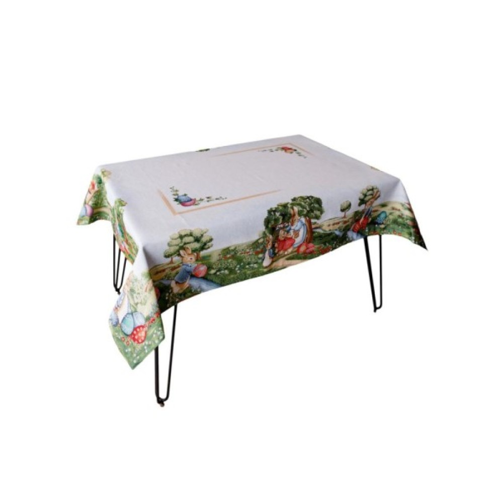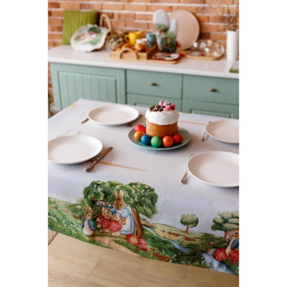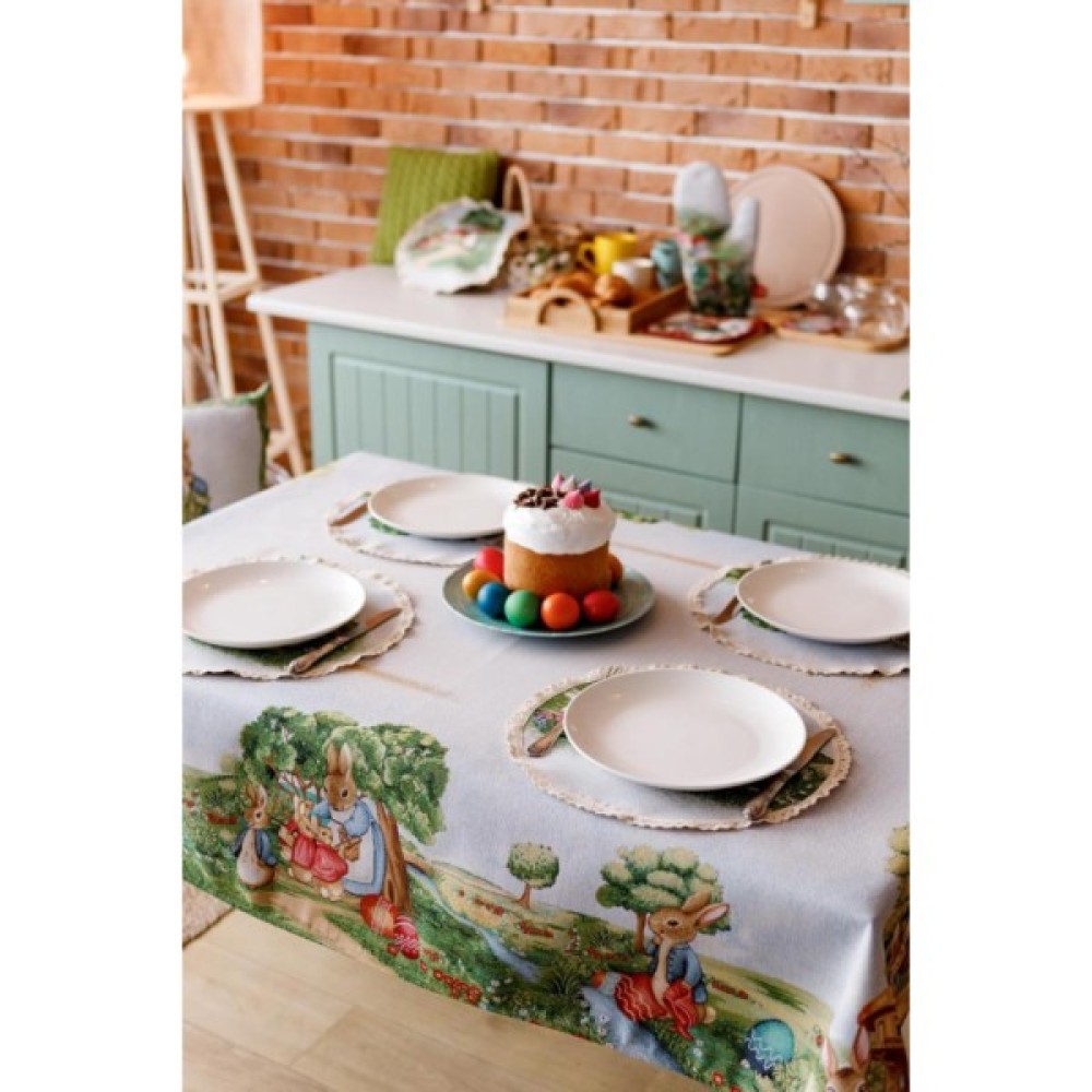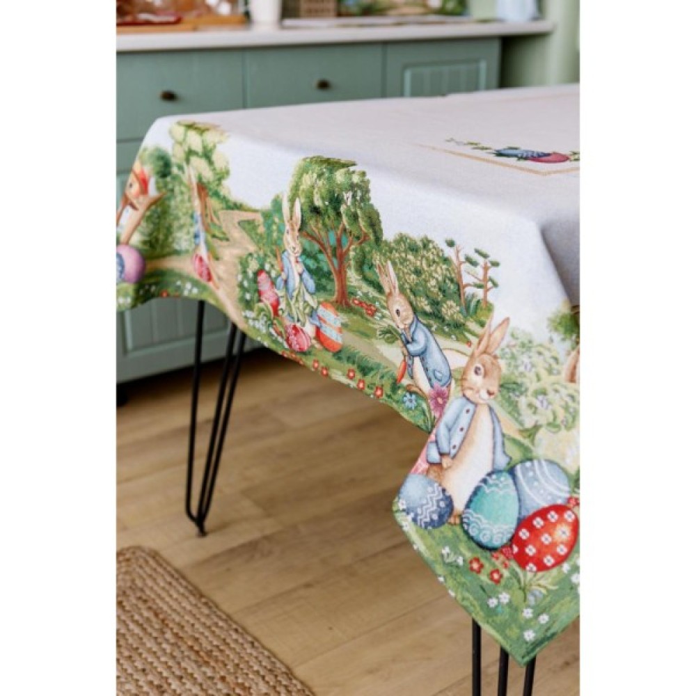 Скатертина на стіл із гобеленової іспанської тканини. Це стильний подарунок сім'ї, друзям, родичам та колегам на честь світлого свята Великодня. Також це прекрасне доповнення до серветок, доріжок, наволочок та подушок з великодньої колекції Галявина.