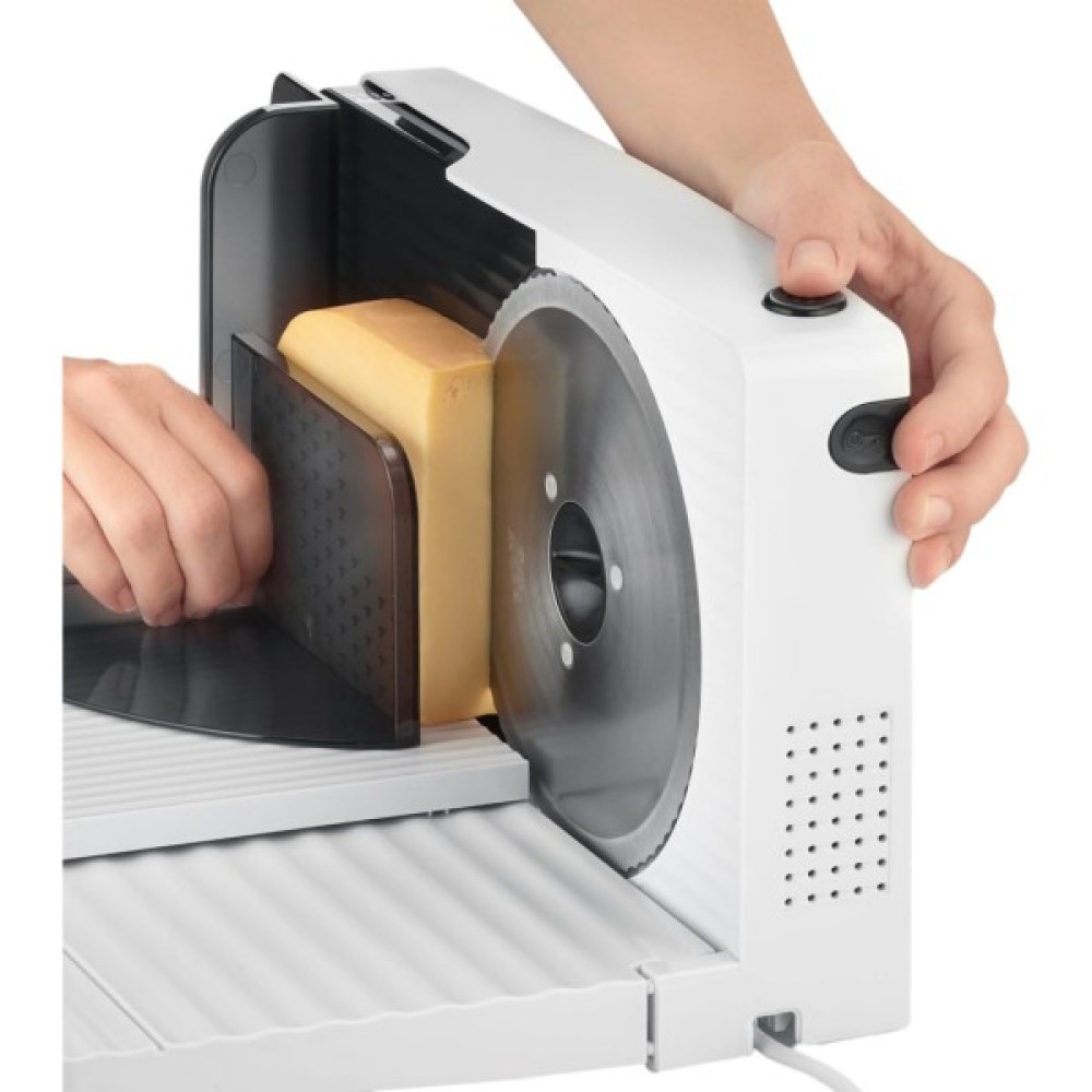 Слайсер оснащений дисковим ножем від RSG Solingen, що гарантує високу якість різання та довговічність. Лезо з нержавіючої сталі легко знімається, що робить очищення простим і швидким. Товщина нарізки регулюється від 0 до 15 мм. Це дозволяє нарізати тонкі скибочки для бутербродів або товсті шматки для страв на грилі.