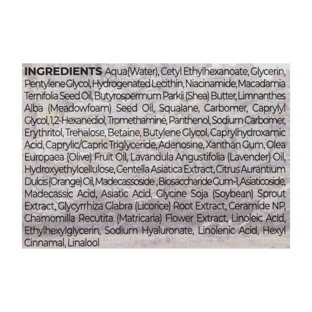 Склад Water, Centella Asiatica Extract (9.8%), Cetyl Ethylhexanoate, Glycerin, Pentylene Glycol, Hydrogenated Lecithin, Niacinamide, Macadamia Ternifolia Seed Oil, Butyrospermum Parkii (Shea) Butter, Limnanthes Alba (Meadowfoam) Seed Oil, Squalane, Carbomer, Caprylyl Glycol, 1,2-Hexanediol, Tromethamine, Panthenol, Sodium Carbomer, Erythritol, Trehalose, Betaine, Butylene Glycol, Caprylhydroxamic Acid, Caprylic/Capric Triglyceride, Adenosine, Xanthan Gum, Olea Europaea (Olive) Fruit Oil, Lavandula Ang