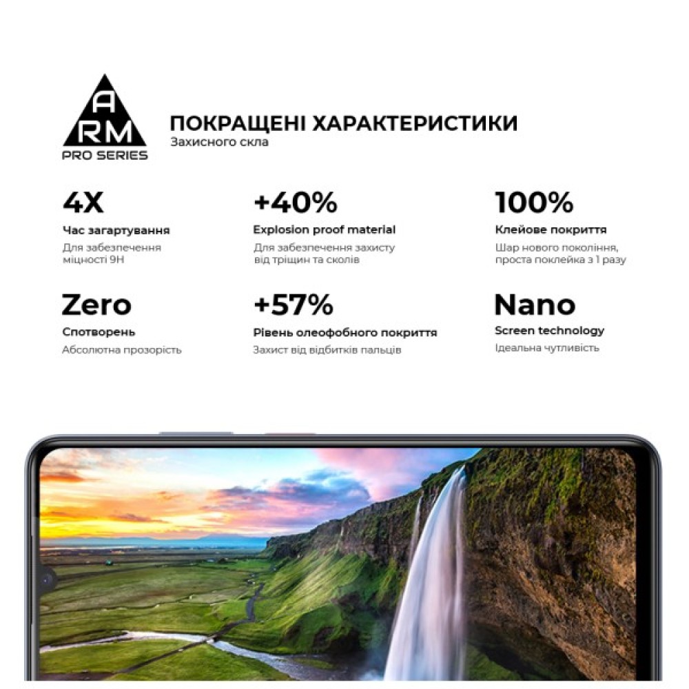 Захисне скло Armorstandart Pro Series має оптимальні габарити та товщину на 0,3 мм. Передбачено вирізи під усі датчики, камери та роз'єми.