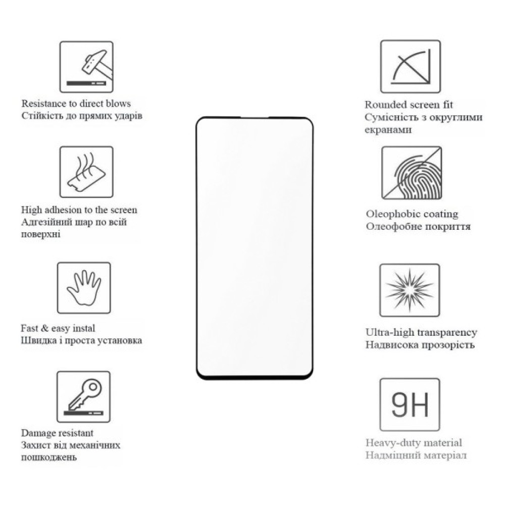• Панель навколо екрана залита кольором, завдяки чому наклеєне скло практично не відрізнити від стандартної передньої панелі смартфона.