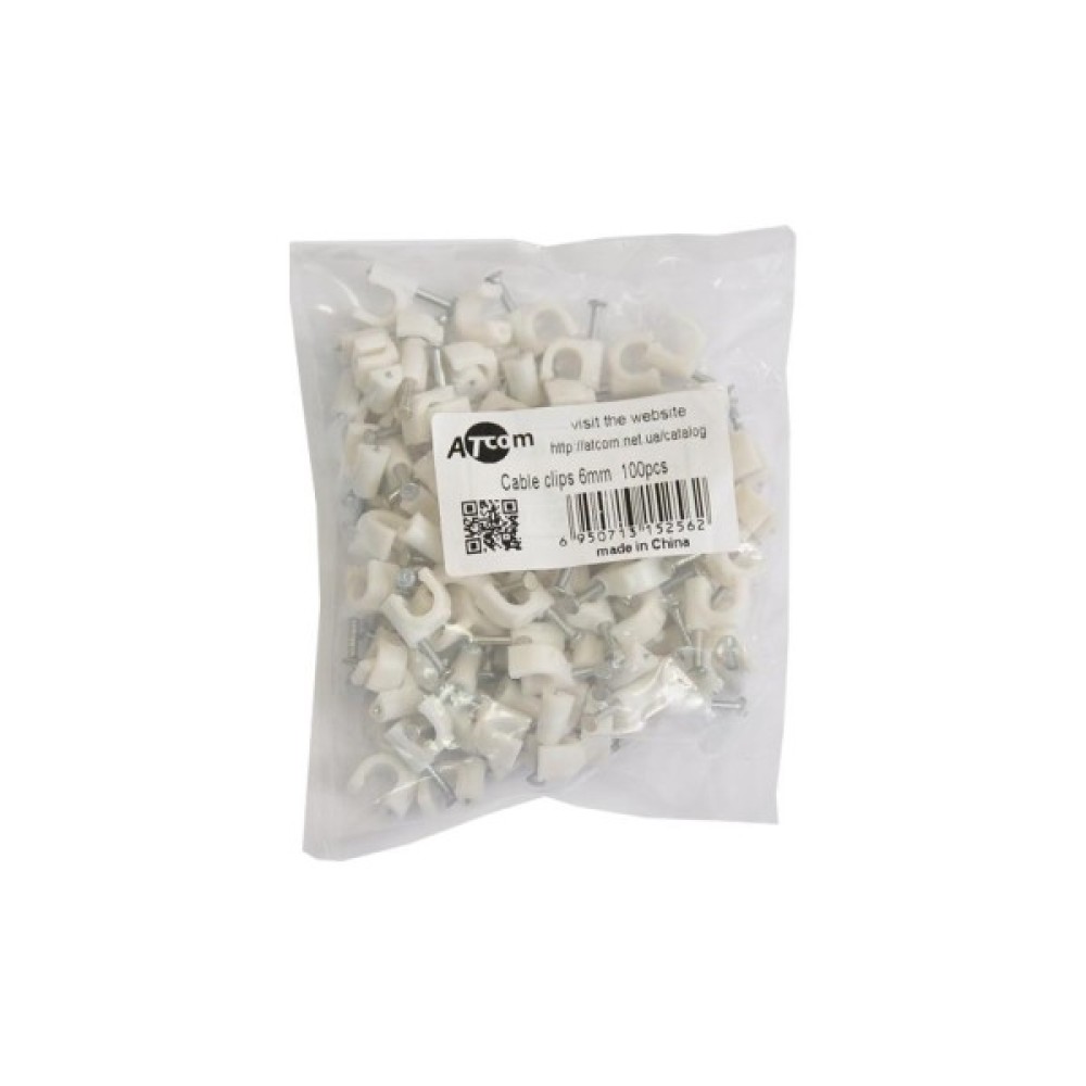 Пластикові скоби для кріплення кабелю використовують для фіксування кабелю або дроту. Скоба Atcom для кабеля 6мм 100шт (15256) призначена для швидкого і надійного кріплення круглих проводів і кабеля до дерева, штукатурки, цегли, бетону. Для кріплення кабелю діаметром 6 мм.