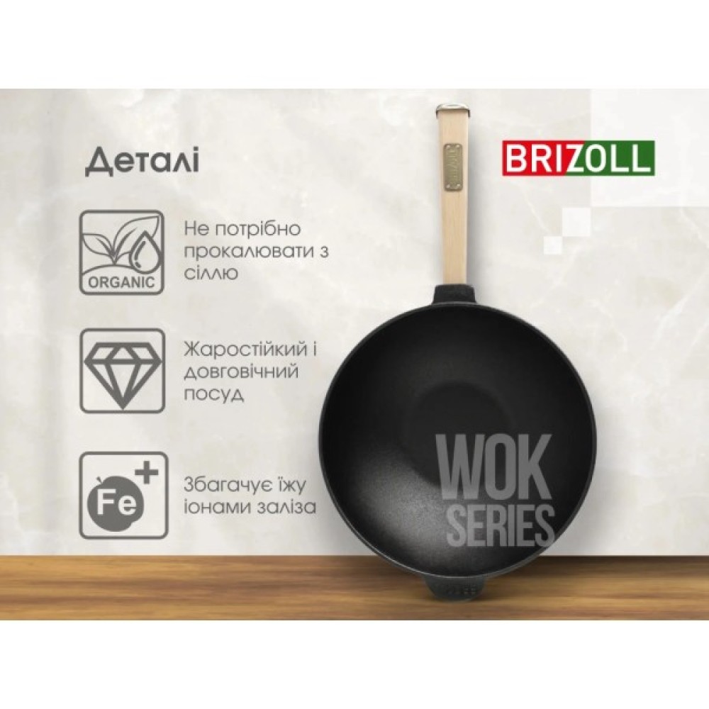Чавунна сковорода WOK ТМ «BRIZOLL» має ідеальну товщину дна та стінок, яка відповідає стандартам якості, Не покрита тефлоновим чи будь-яким іншим покриттям, а має природні антипригарні властивості, які з часом експлуатації зростають.